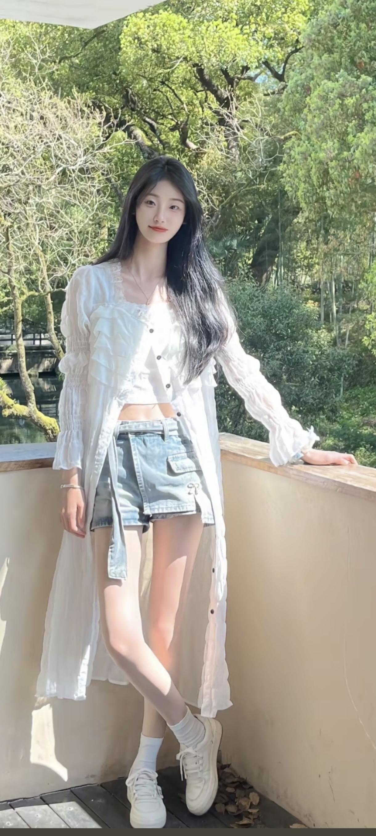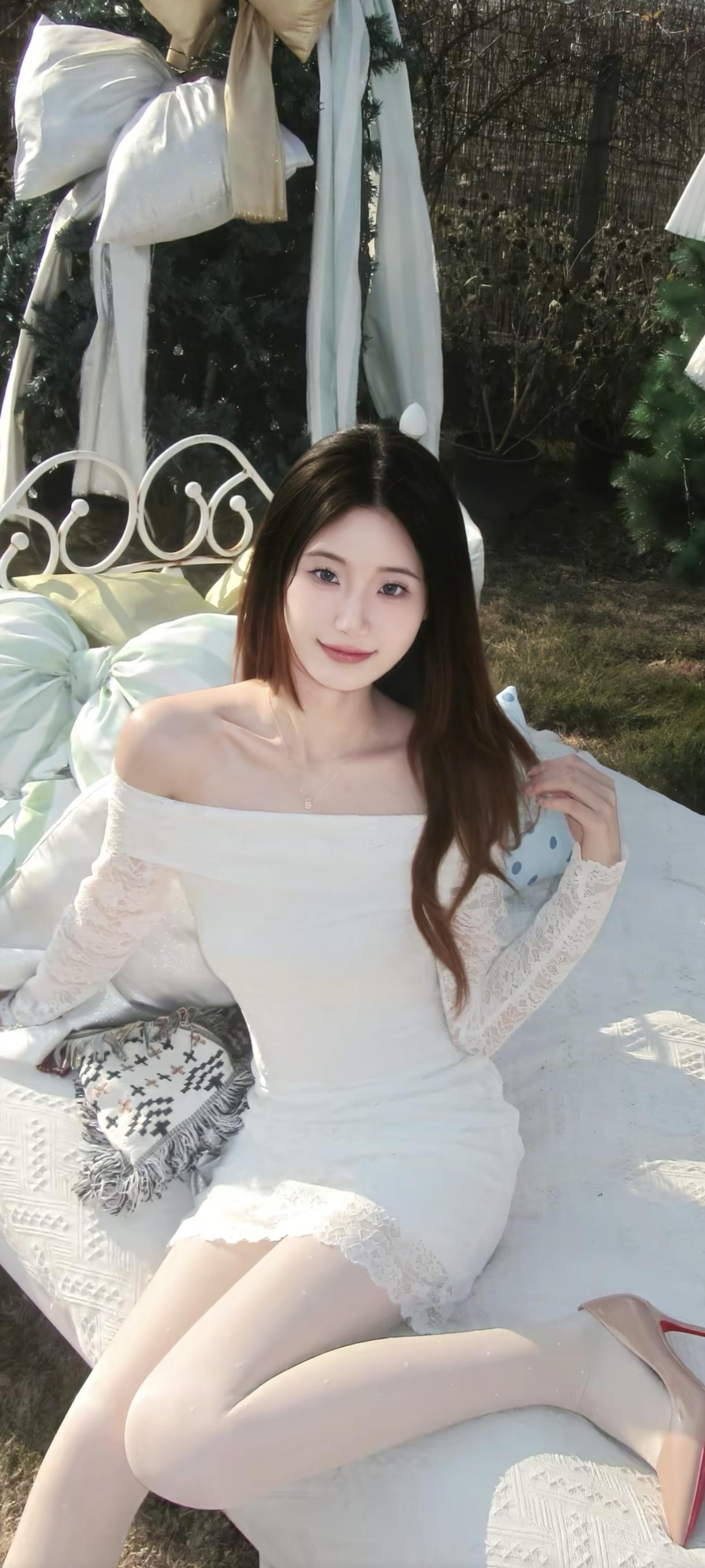 夏日清新穿搭,白色连衣裙搭配珍珠项链,自然风光中的优雅瞬间。