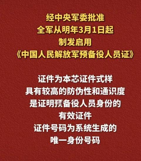 2026年全国统一发放《中国人民解放军预备役人员证》的政策详情与重大意义 经中央军委批准,自2026年3月1日起,全国统一制发启用《中国人民解放军预备役人员证》,同步废止原《中国人民解放军预备役军官证》。这一举措是落实《中华人民共和国预备役人员法》、推进国防后备力量法治化、规范化、现代化的关键抓手,兼具制度完善、管理升级、权益保障与战略支撑多重价值。本文基于官方权威信息,系统梳理证件发放核心详情,深入阐释其法治、管理、权益与国防战略层面的重大意义,为理解新时代预备役制度转型提供学术参考。 一、证件发放核心政策详情 (一)法定依据与实施节点 本次证件发放以**《中华人民共和国预备役人员法》为根本法律依据,由中央军委批准、中央军委办公厅统一部署,自2026年3月1日**起在全国范围正式实施,原《中国人民解放军预备役军官证》同日废止,实现新旧制度平稳衔接、闭环管理。 (二)发放对象与范围界定 发放对象为依法服预备役的预备役军官、预备役军士、预备役兵三类人员,覆盖预备役全序列、全层级,打破原证件仅面向预备役军官的局限,实现身份凭证全覆盖。对象需完成规范登记、纳入预备役编组、符合法定资质,与退役军人优待证定位、功能清晰区分,坚持依法编组、精准管理原则。 (三)证件设计与技术规范 证件采用本芯制式,内置防伪芯片,对接全国兵役信息系统,具备唯一身份编码、生物信息核验、军地联网查询、高等级防伪特征,实现身份核验数字化、管理信息化。证件载明持证人核心信息,是执行训练、征召、勤务、待遇保障的法定有效凭证,权威性与通用性显著提升。 (四)发放流程与管理要求 由军队单位会同地方兵役机关统一组织,遵循一人一档、一人一证、唯一编码、终身不变原则,完成信息采集、资格审核、集中制证、统一发放全流程操作,个人配合核验即可。各级严格证件申领、换发、注销管理,杜绝伪造冒用,保障制度执行的严肃性与规范性。 二、政策实施的重大意义 (一)法治层面:完善预备役制度体系,夯实依法治理根基 本次证件发放是预备役人员法落地的标志性配套举措,补齐身份凭证制度短板,将法律条文转化为可操作、可核验的管理载体,实现预备役人员身份认定、权利义务、管理规范法定化、统一化。新制度覆盖全序列人员,与预备役军衔、选拔、训练、征召制度全面衔接,形成“法律+规章+证件”完整制度链条,推动预备役工作从分散管理转向系统治理,彰显军事法治建设的系统性与严谨性。 (二)管理层面:实现精准化数字化管控,提升后备力量效能 本芯证件与兵役信息系统互联互通,构建军地一体、动态更新、全程可查的数字化管理体系,破解信息碎片化、核验低效、管理粗放等难题。通过唯一编码与芯片核验,可快速完成身份核实、编组查询、动员征召,大幅提升预备役管理、训练、动员效率。统一标准与流程消除区域、层级差异,实现全国一体化管控,为预备役队伍专业化建设提供技术与制度支撑。 (三)权益层面:强化身份认同与保障,激发预备役人员使命感 证件作为法定身份凭证,明确预备役人员法律地位与荣誉属性,有效增强职业荣誉感、归属感与责任意识。依托证件可规范落实训练补助、医疗优先、交通便利、用工保障等法定权益,打通军地权益衔接堵点,解决身份核验、权益落实难题,形成“依法服预备役、权益有保障、荣誉受尊崇”的良性循环,稳定队伍、吸引优质人才,夯实后备力量人才根基。 (四)战略层面:筑牢国防动员基础,支撑国家安全与强军目标 预备役是国家武装力量的重要组成部分,是战时扩编、应急支援的关键力量。统一证件与规范管理,提升预备役正规化水平与快速动员能力,适应现代战争与安全环境需求,强化平战转换、军地协同能力。这一举措彰显我国加强国防后备力量建设的决心,完善现代国防动员体系,为实现新时代强军目标、维护国家主权安全发展利益提供坚实后备保障。 综上所述,2026年3月1日全国统一发放《中国人民解放军预备役人员证》,是新时代预备役制度体系化、法治化、现代化转型的里程碑。政策以法律为依据、管理为核心、权益为纽带、战略为导向,实现覆盖全、标准统、技术新、管理严、保障实的制度升级,既完善军事治理体系,又激发队伍活力,更筑牢国防动员根基。各级应严格落实部署,规范管理、强化协同、保障权益,推动预备役工作高质量发展,为建设巩固国防和强大武装力量提供坚实支撑。