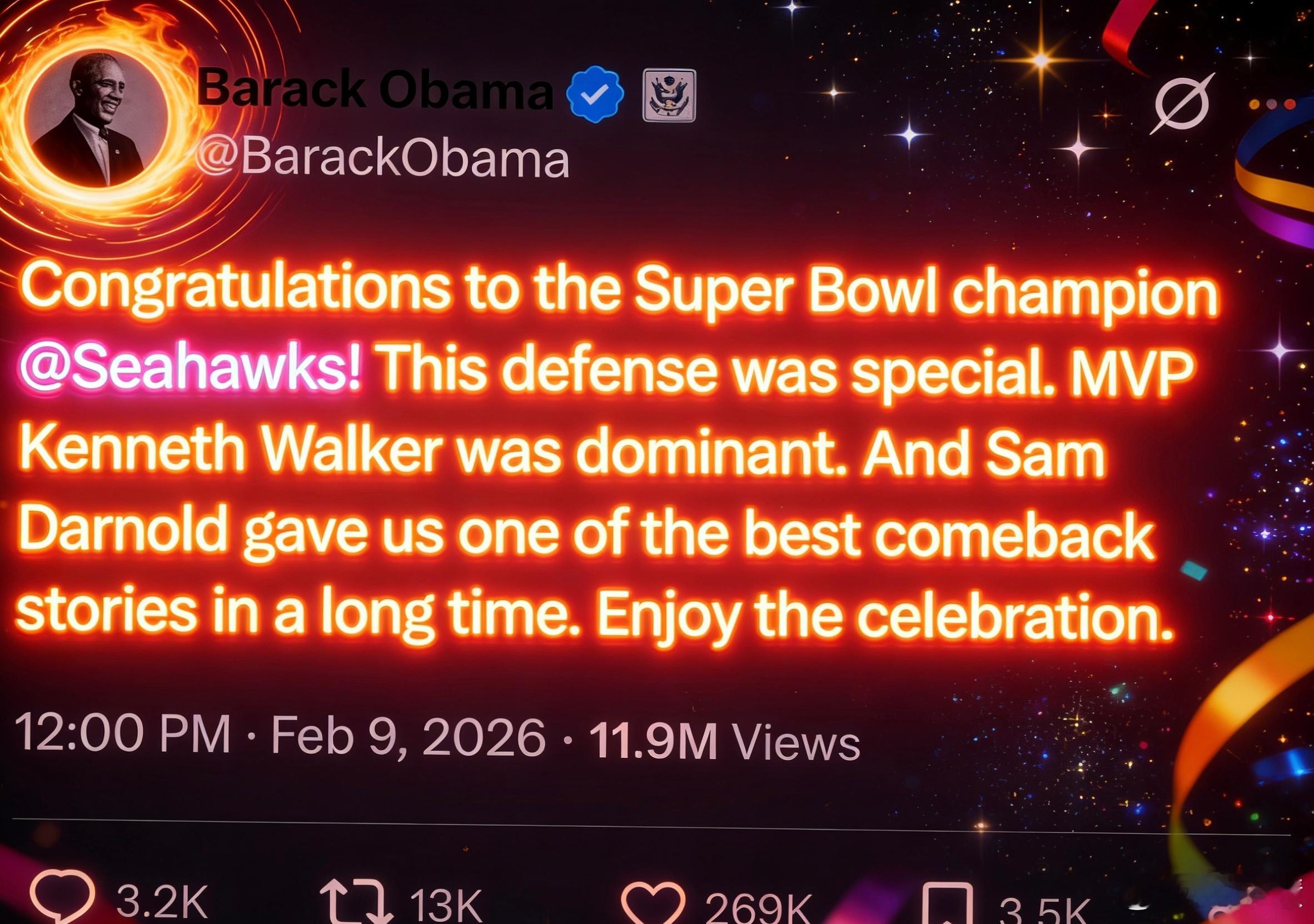 奥巴马有话要有:恭喜超级碗冠军西雅图海鹰队!这支球队的防守表现堪称顶级,MVP球员肯尼斯·沃克统治全场,四分卫山姆·达诺尔德更是上演了近年来最励志的逆袭故事,好好享受夺冠庆典吧!