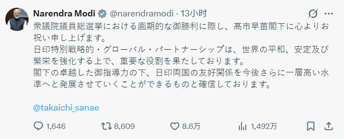 莫迪:我谨向高市早苗阁下致以衷心的祝贺,祝贺她在众议院大选中取得突破性胜利。印度-日本特殊战略和全球伙伴关系在加强全球和平、稳定与繁荣方面发挥着至关重要的作用。我相信,在您的卓越领导下,我们一定能够将日印友好关系提升到更高水平。