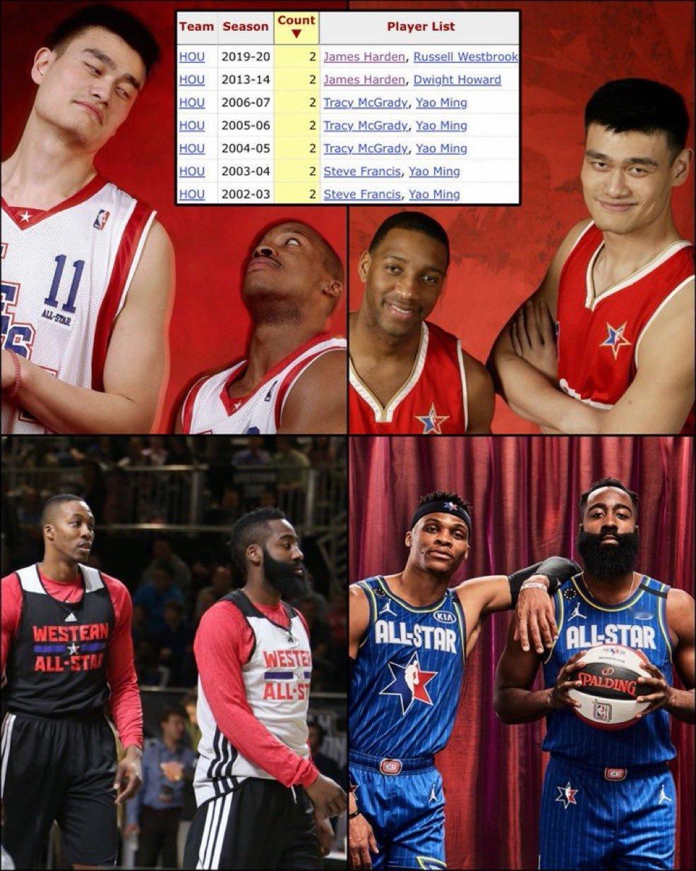 杜兰特和申京成为火箭队史自1997年以来第五对同赛季入选全明星的队友,此前四对分