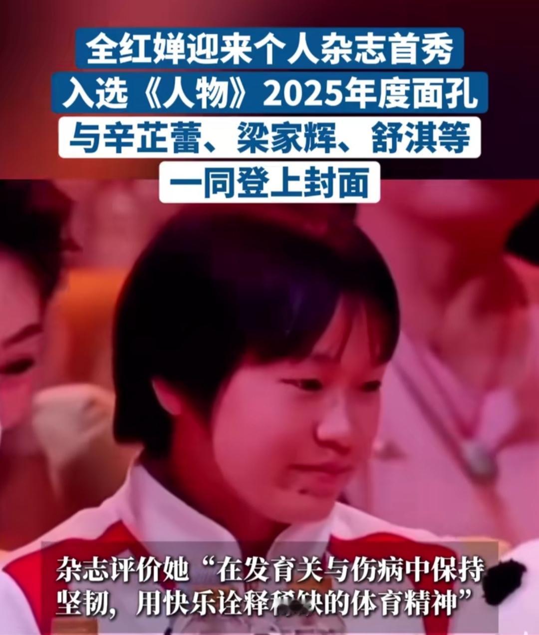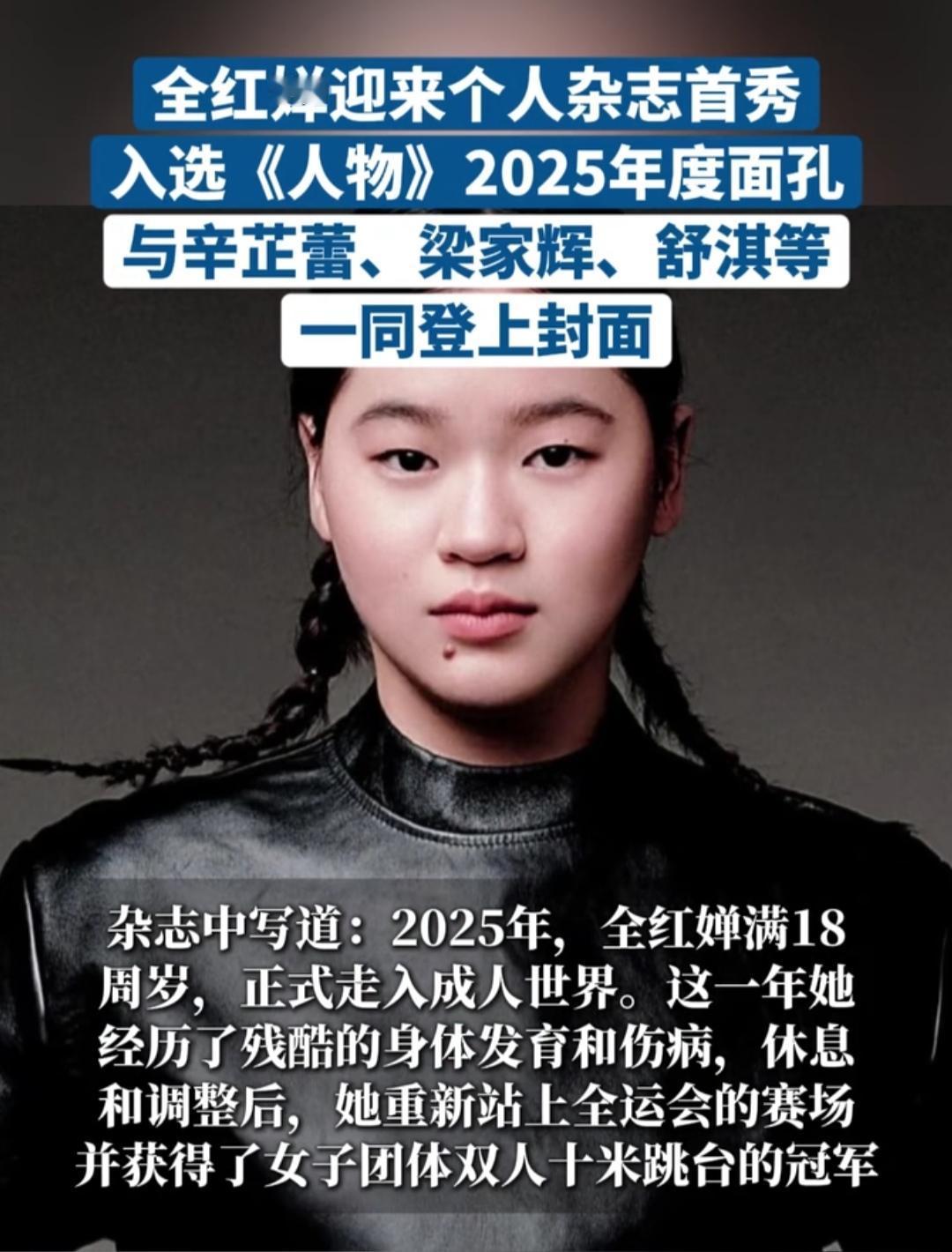 谁能想到那个一跳封神的小姑娘,如今也站上了时尚杂志的封面!全红婵迎来个人杂志首秀,入选《人物》2025年度面孔,和辛芷蕾、梁家辉、舒淇等大咖并肩,这排面直接拉满了。 赛场上的她是所向披靡的跳水小将,水花消失术惊艳众人,台下的她依旧带着少年的纯粹,用最真实的快乐诠释着独一份的体育精神。这份纯粹在当下格外珍贵,也让她圈粉无数。 从跳水台到杂志封面,全红婵的每一步都走得扎实又耀眼。她让我们看到,少年的光芒从不会被限定在一方赛场,努力的人走到哪里,都会闪闪发光,这大概就是最动人的成长模样吧。
