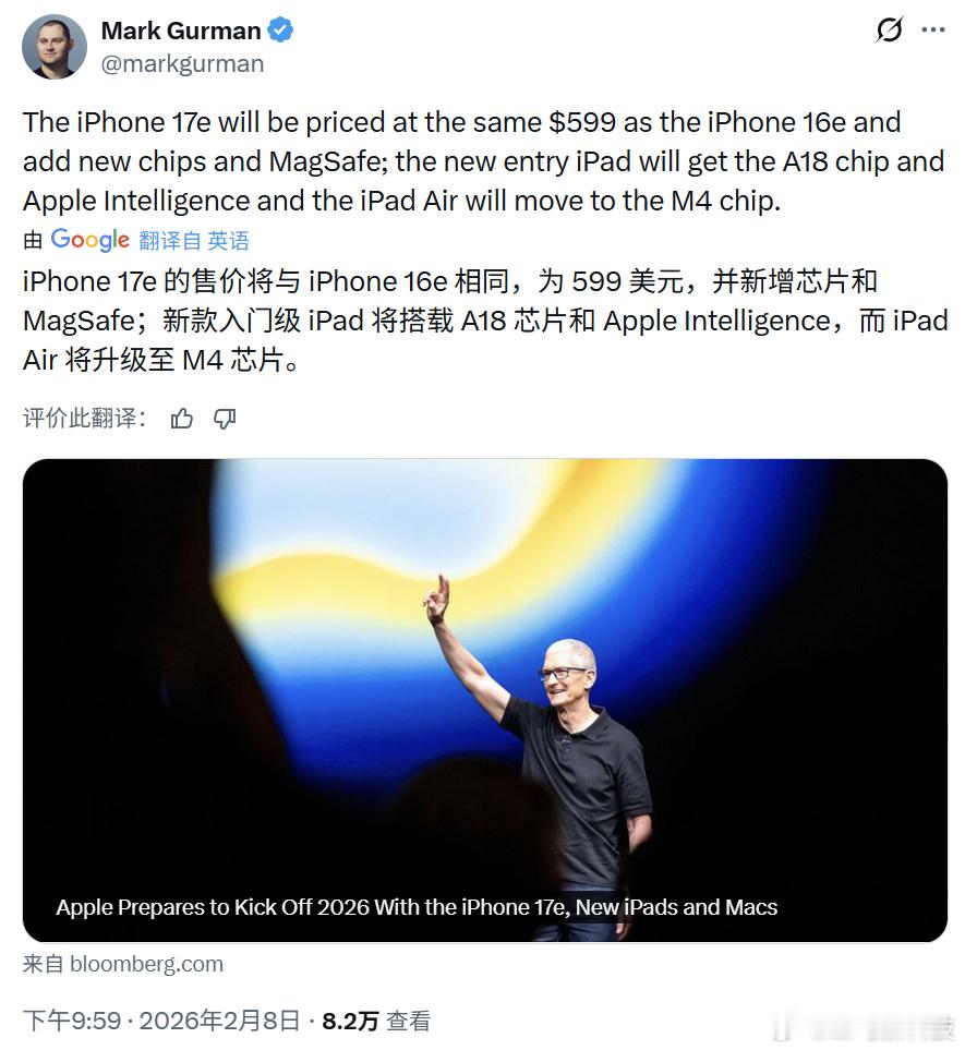 苹果最便宜新机要来了 马克・古尔曼(Mark Gurman)所发表的最新消息透露,iPhone 17e即将发布,预计国行售价4499元新机相比前代主要有四大升级亮点,首先是芯片升级,搭载iPhone 17同款的A19芯片,加入了磁吸环,还将换装苹果最新的自研蜂窝网络芯片与无线通信芯片,屏幕也会升级为灵动岛挖孔屏