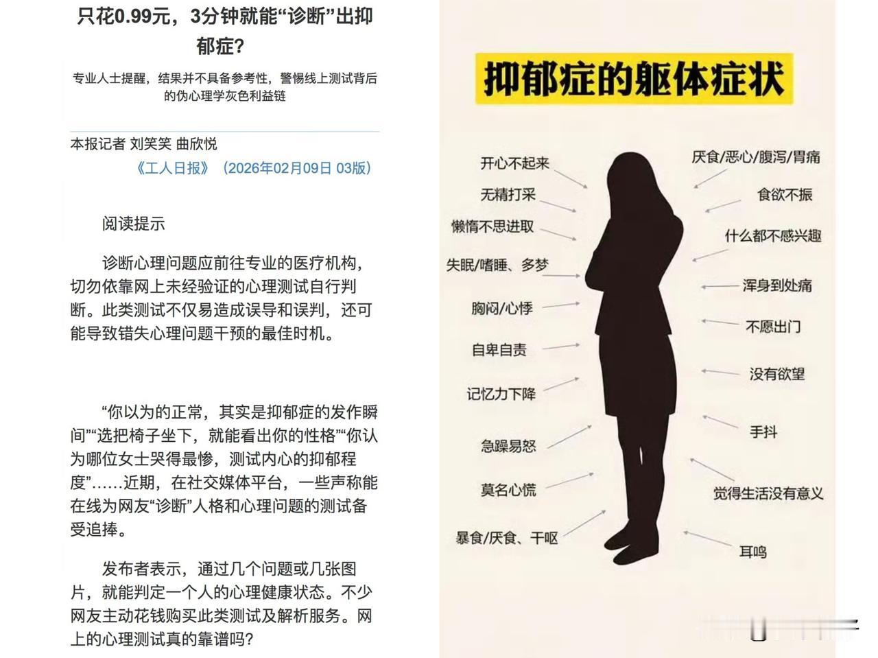 花0.99元、三分钟就能线上“确诊”抑郁症——这类看似便捷的心理测试,实则是披着心理学外衣的灰色生意。我也曾点过类似链接,往往前半段免费,一旦进入解读或详细报告环节便开始收费,我便就此打住。 必须明确,抑郁症的正式诊断必须由精神科医生或具备资质的心理专业人员完成。规范的诊断过程包括详细的面谈(了解个人病史、症状持续时间、严重程度及对社交、工作等功能的影响)、必要的身体检查(排除其他躯体疾病),有时辅以专业量表作为评估参考,绝不是仅凭几分钟的线上选择题就能替代的。 这种随意“贴标签”的行为,极易助长“病耻感”或导致过度“标签化”:可能使仅有轻度情绪困扰的人陷入不必要的恐慌,也可能让真正需要干预的人因得到不严谨的结论而延误就诊。 无论身体还是心理感到不适,都应及时前往正规医院寻求专业帮助。心灵的健康与身体的健康同样重要,也需要同样严肃、科学的对待。