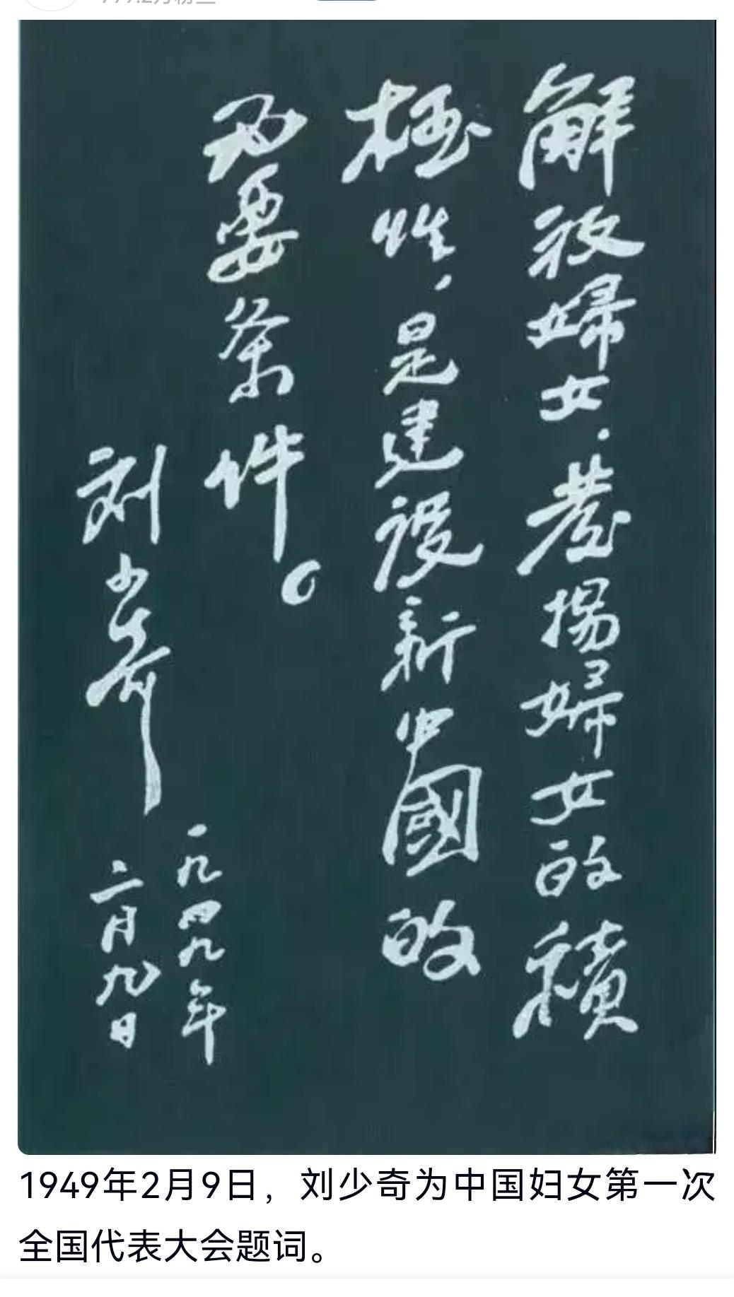 #建国丰功伟绩 历史上的今天:1949年2月9日,刘少奇为中国妇女第一次全国代表大会题词。