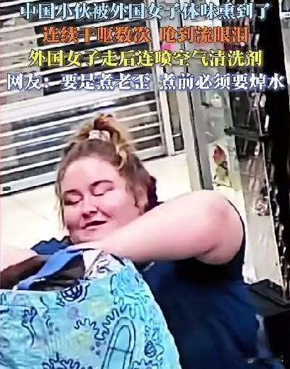 难道大家就没有发现吗? 外国人身上的味道,混合着劣质的香水味,就像和芥末一样直通天灵盖。 这位华人在遇到外国人的时候,被熏得直干呕,不得不拿出清新剂,一个劲的喷喷喷,但似乎症状并没有什么好转。 还有网友分享自己在电梯里碰到两个印度人,那是一个夏天,两名印度人又比较肥胖,身上的汗味夹杂着自带的体香,就像是死老鼠掉进了臭豆腐缸里,又腌了半年的味道,至此以后,他的心里出现了应激反应,只要看到外国人,那种味道就会不由自主的涌上来。 这种不顾及他人的行为,难道不是故意滋事吗?这个事难道就没人吐槽吗?就没人管吗?