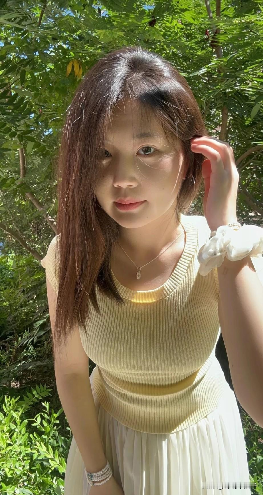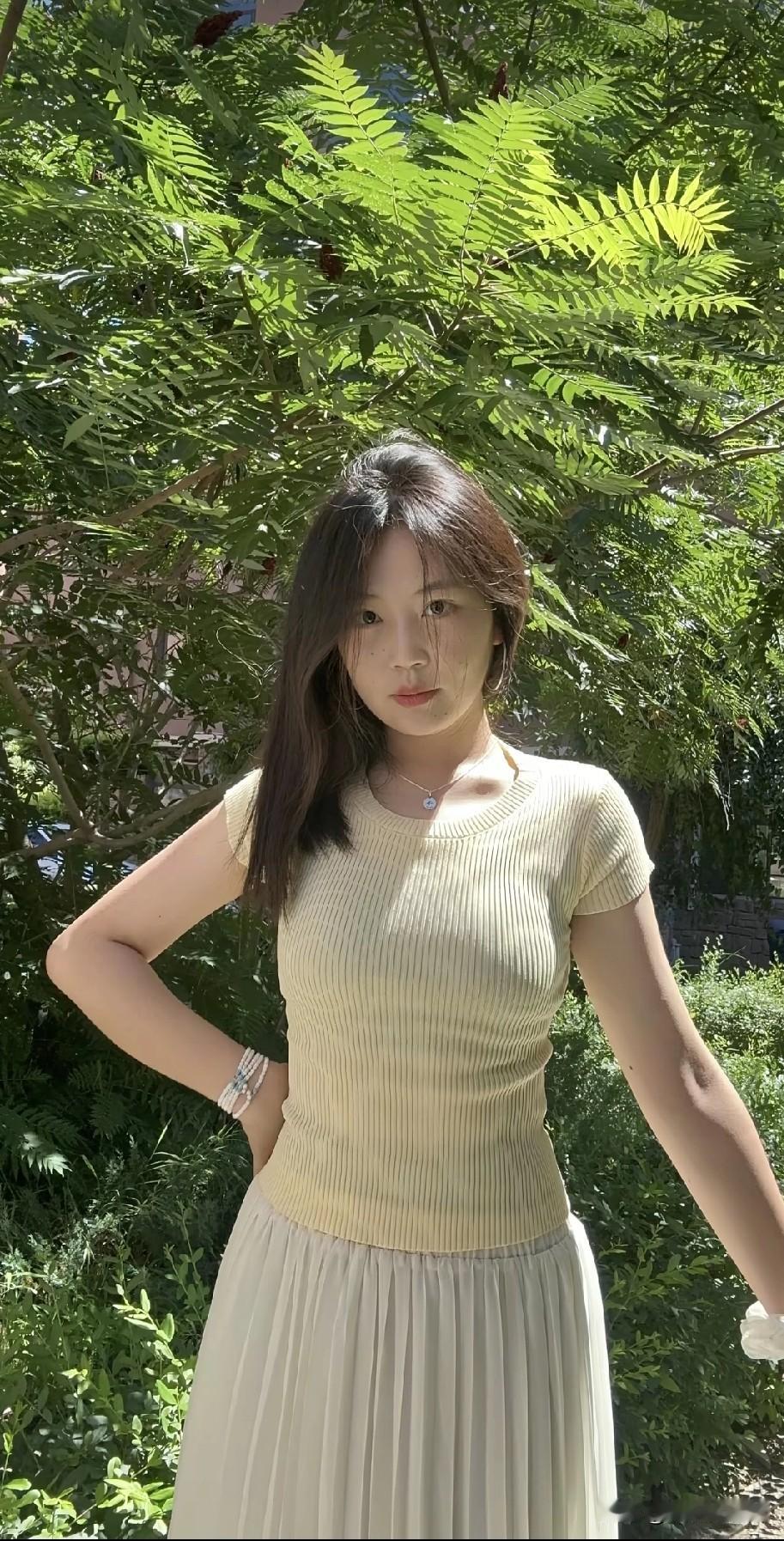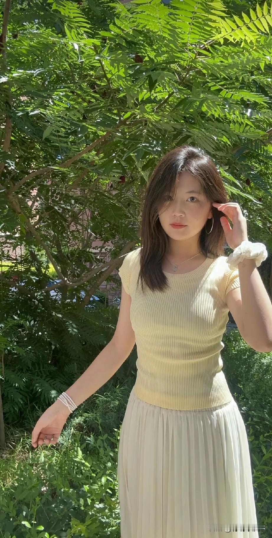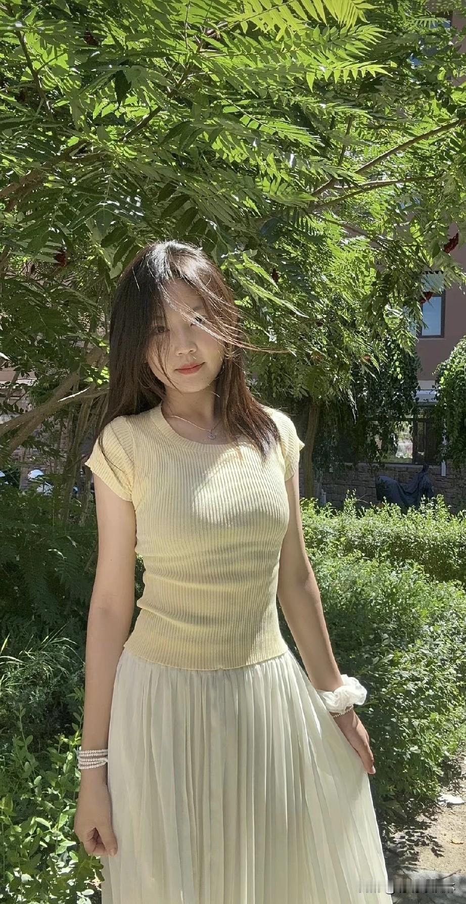 少女清新穿搭,浅黄色针织衫搭配白色长裙,阳光下的自然美