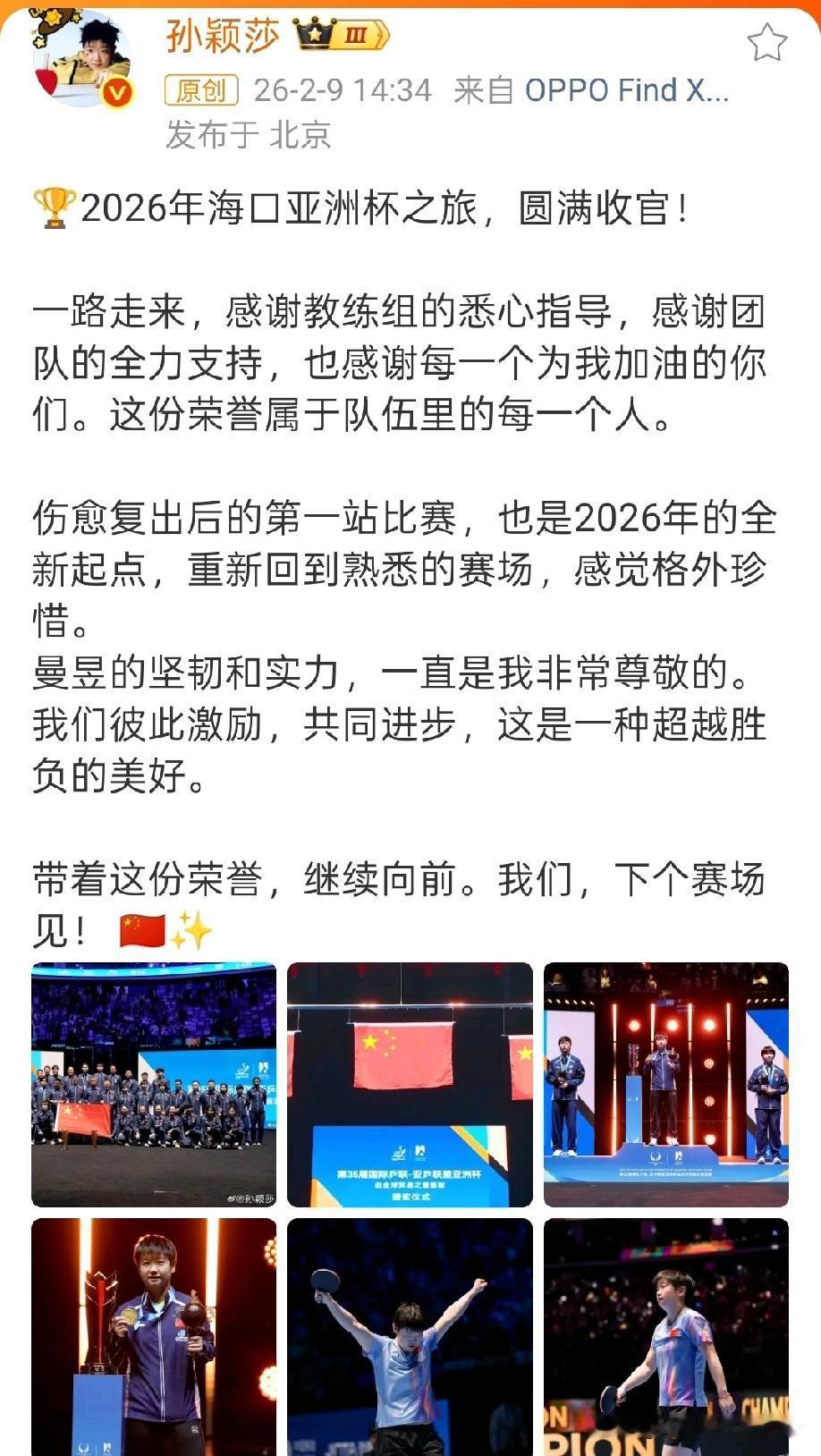 莎局真不是白叫的,亚洲杯最完美的总结。 莎莎先感谢教练组,再感谢团队,后感谢支持她的粉丝,荣誉属于所有人。 然后说26年是全新的起点,会珍惜每一场比赛。 最后告诉所有人,我和曼昱是好朋友,我们彼此激励共同进步,是超越胜负的美好。 看了莎莎这个发文,那些节奏的人应该停止了,如果爱莎莎就爱曼昱,爱曼昱也要爱莎莎,这才是偶像和粉丝应该有的美好。 看了莎莎的微博,能特别表扬王曼昱,彰显莎莎情商和格局。 知道大家为什么都喜欢她,这样的女孩值得所有美好。 图片来自网络侵权可删。