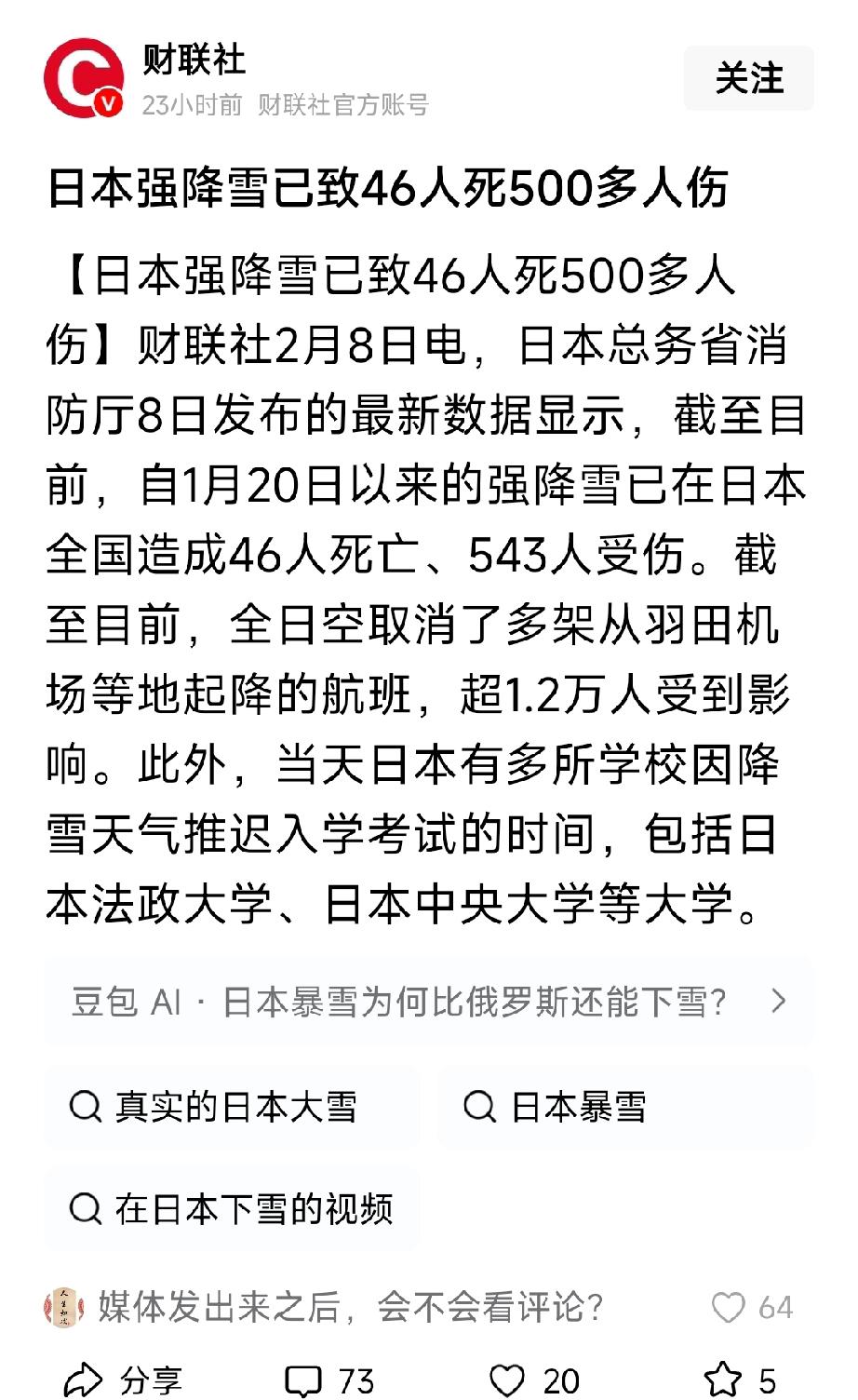 日本又出现大事情了。日本大雪已经造成500多人死伤。