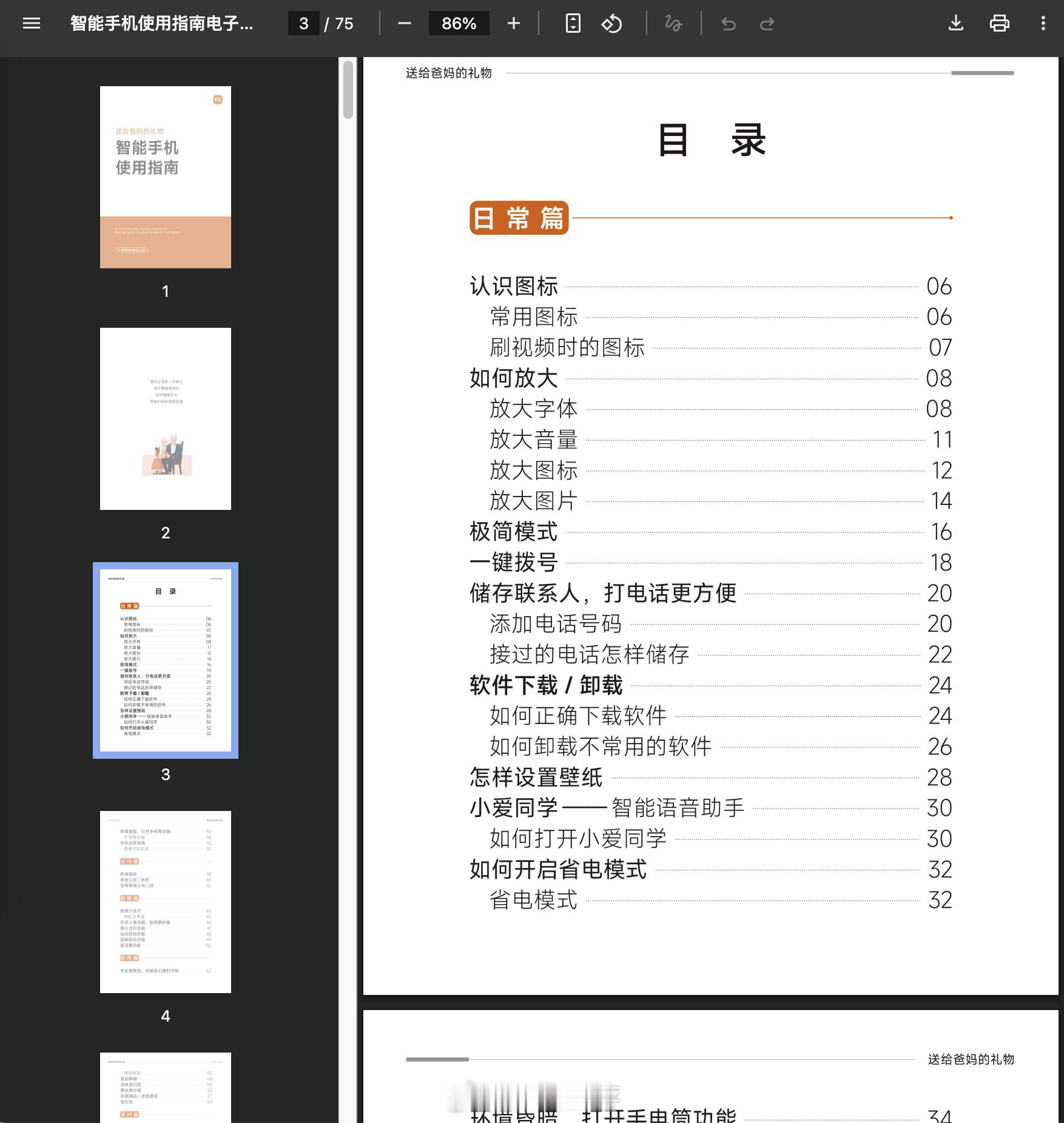 小米之家这个「智能手机使用指南」实体册感觉不错看了下武汉参与的门店名单,就近两家没有,后面哪天路过活动门店再去瞅瞅,先下了电子版,一共75页,还挺详细的,有需要的小伙伴可以领个给爸妈或者家里长辈老人备用~