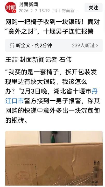 “意外之财!”湖北十堰,一男子网购一套椅子,打开包装,却惊讶的发现,里面有块30斤的大银砖,价值40多万,椅子不值多少钱,卖家也不可能把银砖当赠品呀,男子怕出事,不敢昧下银砖,赶紧报了警,结果出乎所有人意料。网友:飞来横财不能要。 这事就发生在湖北十堰丹江口,当事人是一位张先生,平时就是个普通工薪族,没什么惊天动地的事儿,这次网购椅子,也只是出于一个很简单的想法。 快到春节了,家里的旧椅子都破得没法看了,想着到时候亲戚朋友上门,坐的地方都没有,太没面子,就想着在网上买一套便宜又结实的,能凑合用就行,也没抱什么太高的期望。 快递到了之后,张先生就赶紧拆开包装,准备把新椅子组装起来。 拆包装的时候,一开始也没觉得有什么不一样,都是常见的防震泡沫,还有一股廉价塑料的味道,和平时买的普通家具快递没区别。 可就在他把最后一层泡沫剥开,准备拿椅子部件的时候,突然感觉到手里沉甸甸的,和椅子该有的重量完全不符。 他心里犯了嘀咕,赶紧把那个沉东西翻了出来,一看才发现,那根本不是椅子的零件,而是一块黑乎乎、泛着金属光泽的大家伙。 张先生也没见过这东西,就找来了家里的体重秤,想称称它到底有多重,结果一放上去,指针直接指到了30斤,这一下可把他吓住了。 他拿着这块沉甸甸的金属疙瘩,越看越觉得不对劲,就赶紧拿出手机,查了一下贵金属的实时价格,这不查不知道,一查吓一跳。 按照当时的市价算下来,这块不起眼的金属疙瘩,竟然是银砖,价值足足有40多万。 张先生一下子就懵了,他就是个普通工薪族,40多万,那得是他不吃不喝辛辛苦苦挣好几年才能攒下来的钱。 张先生心里很清楚,这肯定不是卖家送的赠品,一套便宜椅子才多少钱,怎么可能附赠一块40多万的银砖,说不定是哪里弄错了。 他当时也动过一点心思,想着这么大一笔“横财”,要是偷偷留下,说不定能一下子改善家里的生活,但也就只是想想而已。 他很快就冷静下来,知道这东西不是自己的,要是昧下,不仅不合情理,说不定还会触犯法律,到时候就得不偿失了,越想越怕,干脆直接拨通了110报警电话。 民警接到报警后,也觉得这事挺稀奇,长这么大也没遇到过这种“天上掉银砖”的案子。 为了查明真相,民警分成了两路,一路联系快递总部核实情况,另一路则调取了快递分拣中心的监控,连夜排查。折腾了一整夜,终于在一段模糊的监控里,找到了事情的真相。 原来这块银砖,本来是要发往河南的,是一位做贵金属生意的商家的货物。 在快递分拣中心深夜分拣的时候,传送带转得很快,这块30斤重的银砖,因为太重,经过转弯处时,被离心力甩了出去,正好砸在了张先生那箱轻飘飘的椅子快递上,还刺破了纸箱,嵌在了椅子的缝隙里。 当时分拣员太忙,也没注意到这个情况,随手用胶带封好箱子,就把快递发了出去,就这样,这块银砖阴差阳错地送到了张先生手里。 而另一边,河南的银砖失主,这几天也急得团团转,这批银砖是他用来周转资金的,结果物流信息突然停滞,银砖也凭空消失了,他正准备报警求助,就接到了十堰民警的电话。 得知银砖找到了,失主连夜开车跨省赶到丹江口,在派出所里,经过身份核验,顺利拿回了自己的银砖。 不过这事的结局,也有点让人哭笑不得,银砖虽然找回来了,失主的本金保住了,但这几天贵金属市场有波动,他错过了之前计划好的高价出货时间,还是亏了一笔利润。 而张先生,虽然经历了一场惊吓,但因为守住了底线,没有贪那笔飞来横财,最后也落得个心安理得。 大家对此怎么看?欢迎评论区留下您的观点!