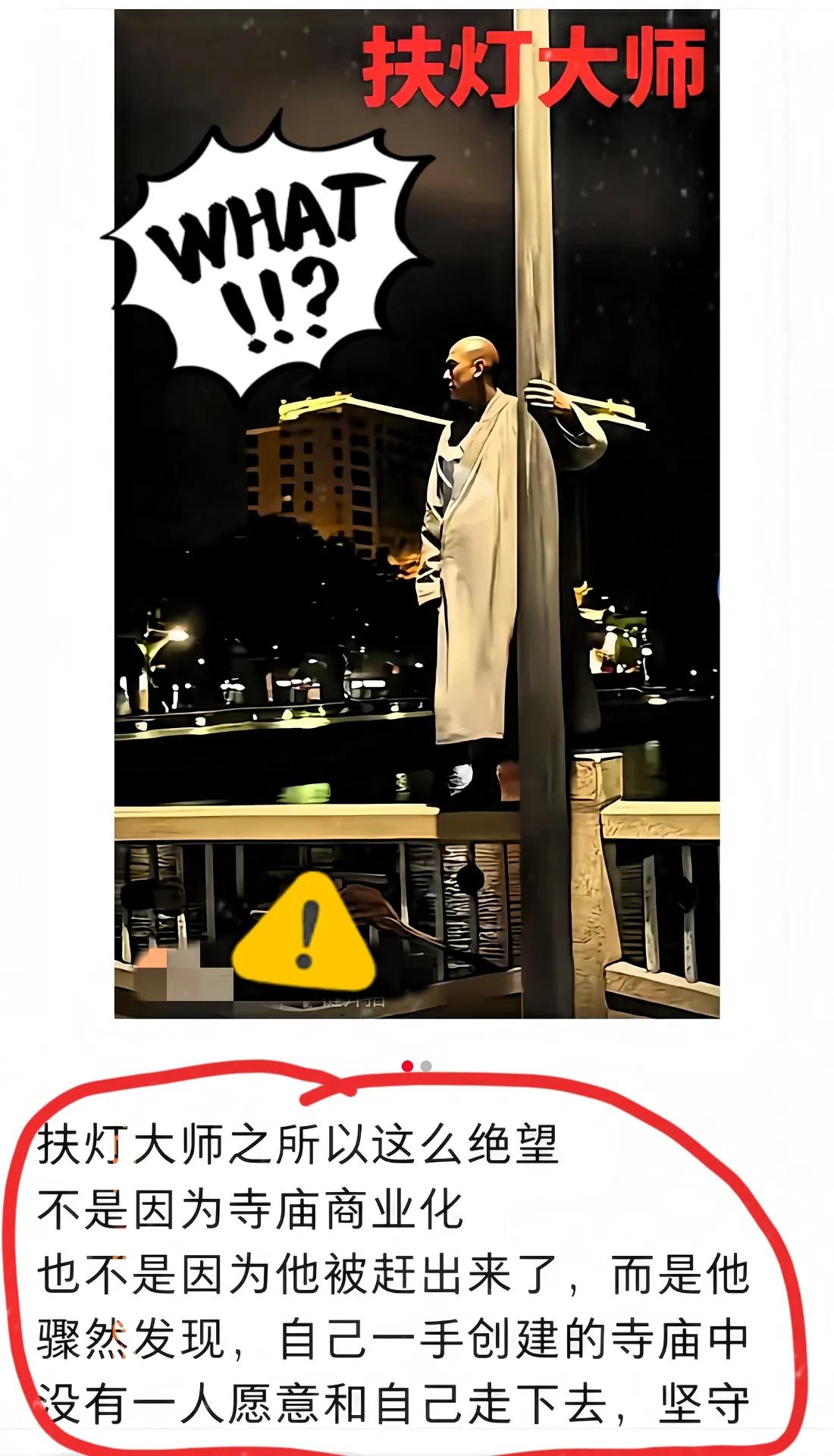 扶灯大师这一跳,对佛教的影响力,远远超过释永信被捕。释永信作为少林寺的主持,贪财好色,自绝于人民,自绝于佛祖。扶灯大师作为唐僧,比释永信强多了。扶灯大师,虽然被世人评为好人,但他毕竟不是虔诚的佛教徒。释永信被捕,对佛教的影响,只是暂时的,不能说彻底。但是,扶灯大师这一跳,对佛教的影响,非比寻常。此时此刻,急需高僧,大德,学者,能提出比《大乘起信论》更高的理论来解释此事。如果理论水平跟扶灯大师一样,甚至更低,那就成了笑柄。 有网友说,他也是三十六行之一,出家也是一种职业而已,何必自寻死路。不打东家活,另找西家活。 也有人说,扶灯大师这事儿太震撼了,比释永信事件影响还大,真的需要合理的说法来解释啊,[祈祷][祈祷][祈祷]