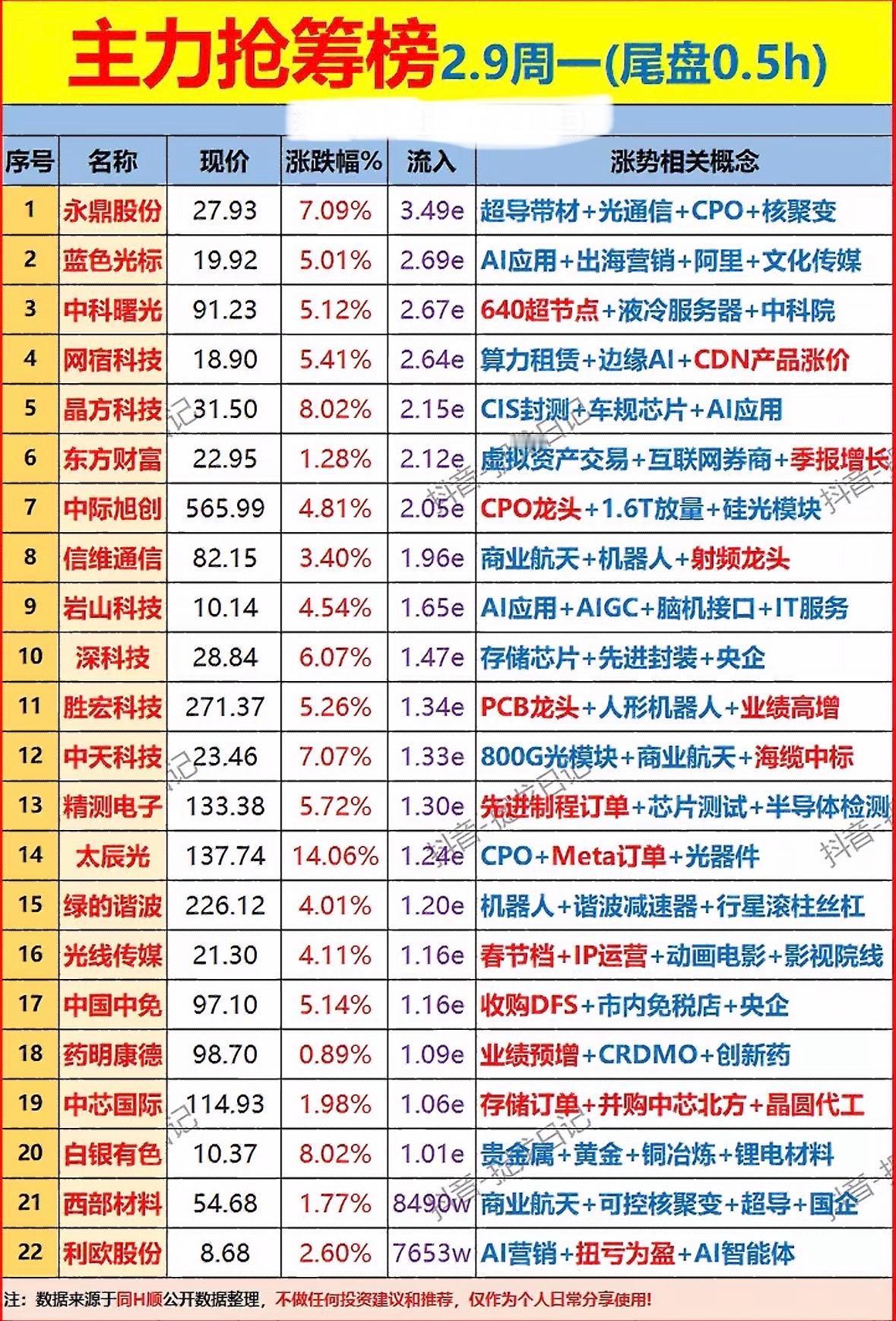 主力抢筹榜2.9周一(尾盘0.5h),强势股大揭秘! "AI与科技股领涨,光通信、机器人概念抢筹活跃,资金青睐创新赛道与业绩预增龙头。"