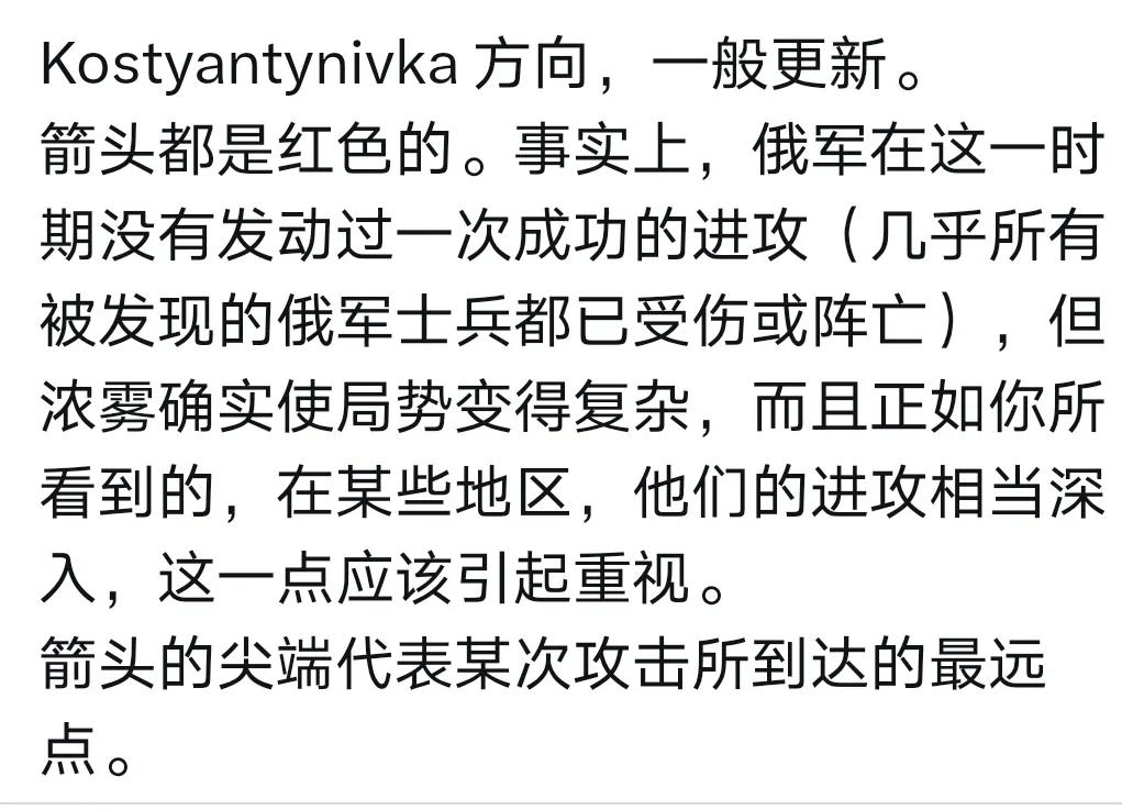 康斯坦丁诺夫卡战线,俄持续保持对乌军压力。但未取得实质进展。图中红色箭头是俄军渗透方向。