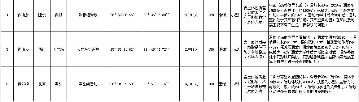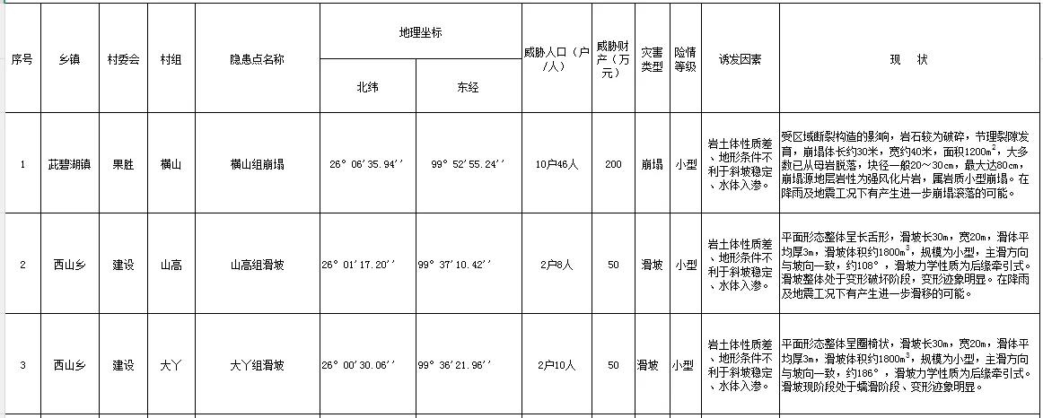 洱源县新增6个地质灾害隐患点→ 洱源县人民政府关于新增地质灾害隐患点的公告 据《地质灾害防治条例》《云南省自然资源厅关于印发〈云南省地质灾害隐患点认定与核销管理办法(试行)〉的通知》(云自然资地勘〔2022〕101号)要求,通过属地乡镇申报,经云南地质工程第二勘察院有限公司调查核实、论证, 洱源县茈碧湖镇果胜村委会横山组崩塌、洱源县凤羽镇凤河村委会雪梨组滑坡、洱源县西山乡建设村委会大丫组滑坡、洱源县西山乡建设村委会山高组滑坡、洱源县西山乡建设村委会岩根组滑坡、洱源县西山乡西山村委会大光场组滑坡等6个隐患点符合新增地质灾害隐患点认定条件,已按程序纳入地质灾害隐患点进行统一管理,现予以公告。 附件:洱源县2026年新增地质灾害隐患点信息表