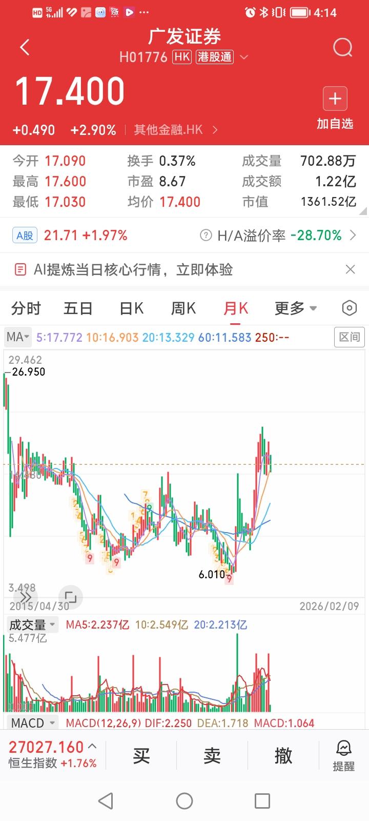 什么情况?广发证券A、H股双双联袂上涨,而且H股比A股涨的还好。广发证券A收盘上涨1.97%,广发证券H收盘上涨2.90%。 从日线上看,广发证券股价受60日均线压制,走势不算强势。但从月线看,广发证券稳打稳扎的台阶牛的趋势俨然矣。 广发证券从2024年924行情启动以来,股价冲上15元后,平台整理了10个月向上突破,涨到21元后,目前平台整理了7个月了。 这个21元整理平台到底是顶还是底?如果在4月底前这个平台还没有跌破,很可能就是新一轮升势的底部。因为历史上的券商股的顶部大部分是尖顶。