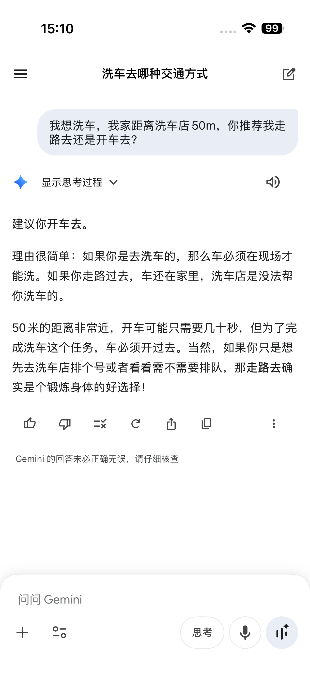 “我想洗车,我家距离洗车店50m,你推荐我走路去还是开车去?”