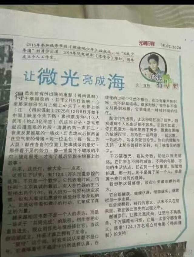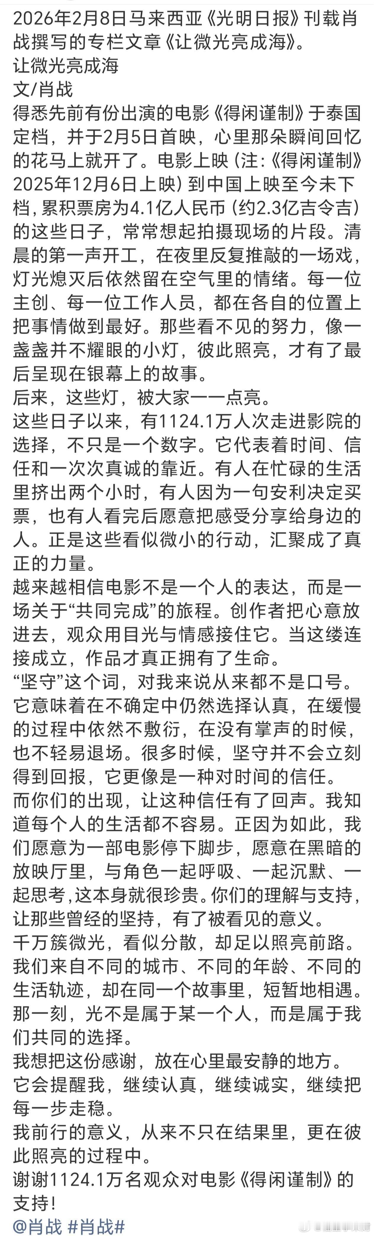 肖战专栏文章登马来西亚《光明日报》让微光亮成海文/肖战得悉先前有份出演的电影《得闲谨制》于泰国定档,并于2月5日首映,心里那朵瞬间回忆的花马上就开了。电影上映(注:《得闲谨制》2025年12月6日上映)到中国上映至今未下档,累积票房为4.1亿人民币(约2.3亿吉令吉)的这些日子,常常想起拍摄现场的片段。清晨的第一声开工,在夜里反复推敲的一场戏,灯光熄灭后依然留在空气里的情绪。每一位主创、每一位工作人员,都在各自的位置上把事情做到最好。那些看不见的努力,像一盏盏并不耀眼的小灯,彼此照亮,才有了最后呈现在银幕上的故事。后来,这些灯,被大家一一点亮。这些日子以来,有1124.1万人次走进影院的选择,不只是一个数字。它代表着时间、信任和一次次真诚的靠近。有人在忙碌的生活里挤出两个小时,有人因为一句安利决定买票,也有人看完后愿意把感受分享给身边的人。正是这些看似微小的行动,汇聚成了真正的力量。越来越相信电影不是一个人的表达,而是一场关于“共同完成”的旅程。创作者把心意放进去,观众用目光与情感接住它。当这缕连接成立,作品才真正拥有了生命。“坚守”这个词,对我来说从来都不是口号。它意味着在不确定中仍然选择认真,在缓慢的过程中依然不敷衍,在没有掌声的时候,也不轻易退场。很多时候,坚守并不会立刻得到回报,它更像是一种对时间的信任。而你们的出现,让这种信任有了回声。我知道每个人的生活都不容易。正因为如此,我们愿意为一部电影停下脚步,愿意在黑暗的放映厅里,与角色一起呼吸、一起沉默、一起思考,这本身就很珍贵。你们的理解与支持,让那些曾经的坚持,有了被看见的意义。千万簇微光,看似分散,却足以照亮前路。我们来自不同的城市、不同的年龄、不同的生活轨迹,却在同一个故事里,短暂地相遇。那一刻,光不是属于某一个人,而是属于我们共同的选择。我想把这份感谢,放在心里最安静的地方。它会提醒我,继续认真,继续诚实,继续把每一步走稳。我前行的意义,从来不只在结果里,更在彼此照亮的过程中。谢谢1124.1万名观众对电影《得闲谨制》的支持!