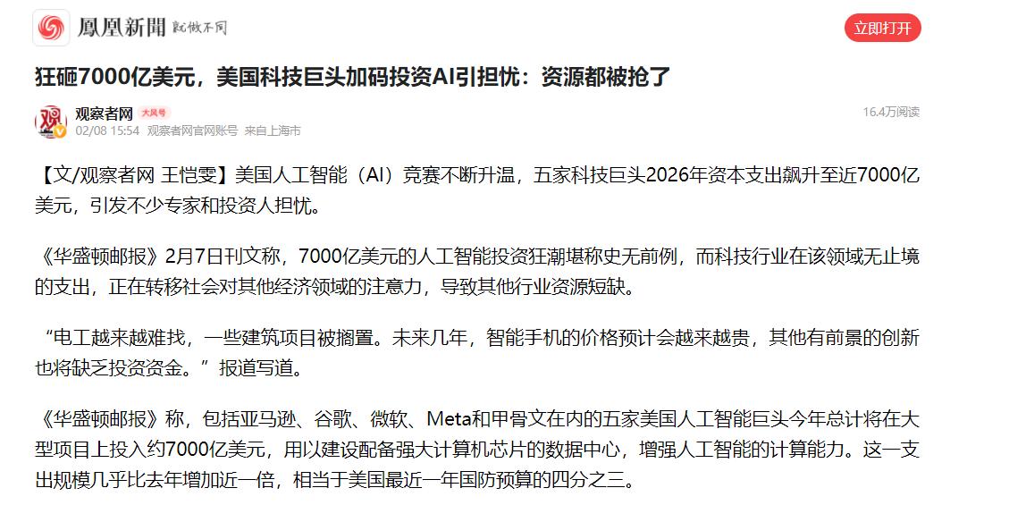 美国科技巨头砸7000亿美元搞AI,为啥大家担心其他行业没饭吃? 最近有个新闻,美国的五大科技巨头,像亚马逊、谷歌、微软这些,2026年要一起拿7000亿美元搞AI。 这笔钱特别多,多到什么程度?比去年多了快一倍,比2024年多了两倍半还多。 2月7号,美国的《华盛顿邮报》就报道了这事,这些科技公司在AI上花钱没个够,把美国社会上的很多资源都抢过去了,导致美国其他行业没资源可用,日子越来越难。 具体来说,现在美国想找个电工都特别难,不少建筑项目都停了;未来几年,美国老百姓用的智能手机会越来越贵,还有一些本来能发展起来的新东西,也因为没人投钱,搞不下去了。 可能有人会问,搞AI不是好事吗?其实本身是好事,但问题出在美国科技公司花钱太没节制。 道理很简单,不管哪个国家,社会上的资源就那么多,钱、工人、生产东西的能力,都是有限的。美国的这些资源全被AI行业抢走了,他们国内的其他行业,自然就不够用了。 先说说工人的事,这也是美国最头疼的。建AI需要大量的数据中心,而建数据中心,得要很多熟练的电工、技工。 这些岗位给的工资,比美国普通建筑活高很多,以前干电工一年赚十几万美金,现在去建AI数据中心,一年能赚20万美金以上。 这么高的工资,美国的电工自然都去干这个了,普通建筑项目就找不到人了。 现在美国每年缺8万多电工,未来缺口还会更大,整个建筑行业明年大概要缺50万工人。很多住宅、商业楼的建设,因为找不到电工和技工,只能停着,工期一推再推。 就连搞AI的公司和英伟达的老板,都喊美国年轻人别学计算机了,去当电工,可见他们的工人有多缺。 再说说手机涨价的事,这也是美国百姓要面对的。手机离不了芯片,现在美国的AI数据中心疯狂抢芯片,导致生产手机、电脑用的芯片不够了。 苹果公司都公开说,生产手机和电脑的芯片不够用,厂商只能花更多钱抢芯片,成本高了,最后还是美国消费者买单,手机、电脑会越来越贵。 除此之外,美国那些搞生物医药、清洁能源的小公司,也因为没人投钱,很难发展。现在美国的投资人,都把钱投给AI了,其他行业拿不到钱,很多好想法没法实现。 而且,这些科技巨头砸这么多钱搞AI,也不一定能赚钱,更像是赌一把,现在很多AI公司还在巨亏,科技公司的市值也蒸发了很多,最后还是会影响美国百姓的生活。 AI本身没问题,问题是美国科技公司花钱太疯狂,导致国内资源失衡,其他行业被挤压,倒霉的都是美国老百姓。