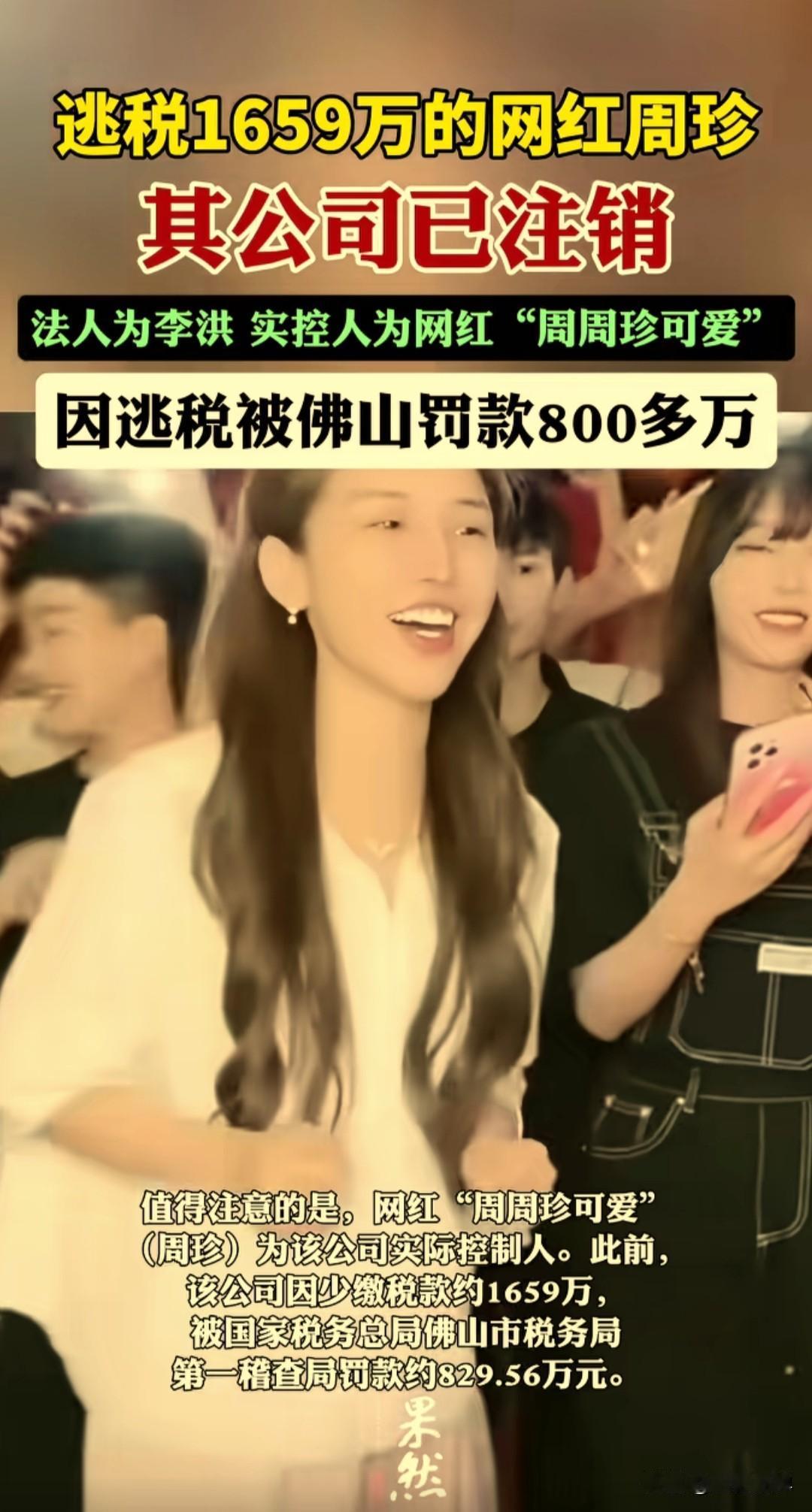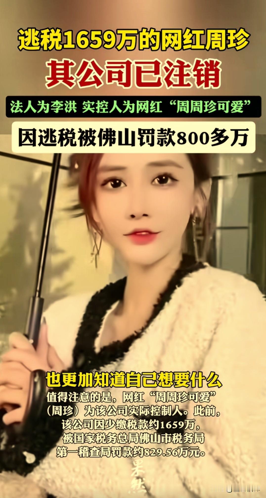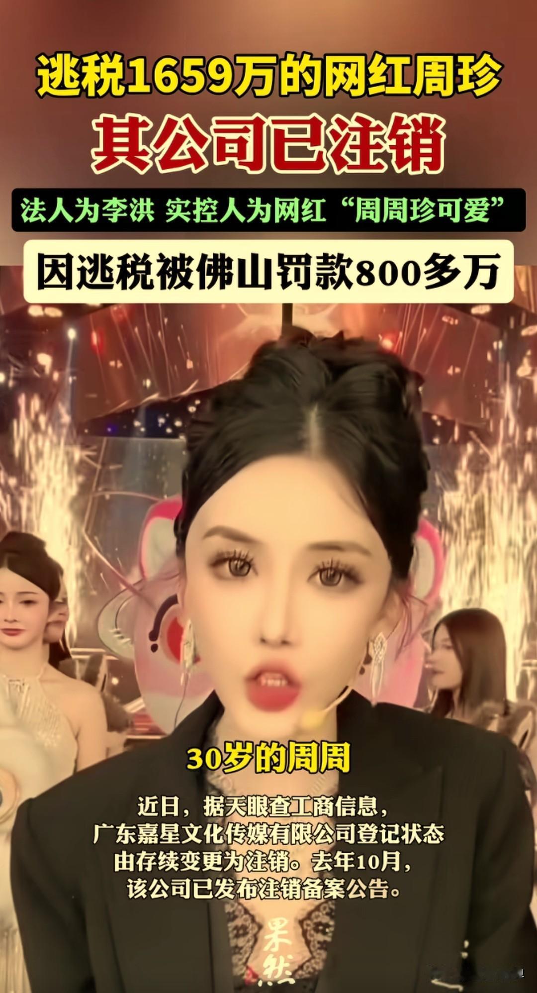 逃税1659万后注销公司,“周周珍可爱”的精明操作,藏着网红行业的吸金游戏 829万元税务罚单开出后,“周周珍可爱”的直播间销售额反而像脱缰野马,三个月内通过29场直播狂揽3.52亿元,日均进账约400万元。 而她实际控制的公司,在处罚公布仅45天后便启动注销,最终彻底“消失”在工商信息中,与取消的“双十二”直播计划,共同构成了一场荒诞的行业现实剧。 “周周珍可爱”(本名周珍),这位坐拥5000万粉丝的美妆直播顶流,曾是平台和品牌方眼中的香饽饽。如今,她的名字再次登上热搜,却不再是直播间里喊着“家人们冲”的主播,而是广州税务局处罚决定书上的主角——其名下公司因偷逃税款1659.13万元,被罚款829.56万元。 更耐人寻味的是,处罚公布仅45天后,涉事的广东嘉星文化传媒有限公司便迅速启动注销程序,并于2026年2月6日正式注销,注销原因为“决议解散”。 这一操作立刻引发巨大争议:有人质疑这是“金蝉脱壳”,试图逃避后续责任;而税务部门则回应,处罚已执行完毕,公司注销是正常市场行为,与处罚无直接关联。 无论如何,这家承载巨额利益的公司悄无声息地消失了,而“周周珍可爱”本人,却依然活跃在直播镜头前,继续着带货事业。 这一案例再次敲响警钟: 1. 网红经济并非法外之地:监管趋严下,任何偷税漏税攫取暴利的行为,终将付出沉重代价。 2. 注销不等于免责:公司注销后,相关责任人的法律责任依然存在,税务与司法机关可追溯至个人。 3. 消费者需保持清醒:为偶像买单的同时,更应关注其背后商业行为是否合法合规。 “周周珍可爱”的故事,是流量时代的缩影。当巨大利益摆在面前,人性的贪婪与侥幸易让人迷失,但唯有守住诚信与合规的底线,无论是网红主播还是普通创业者,才能行稳致远。