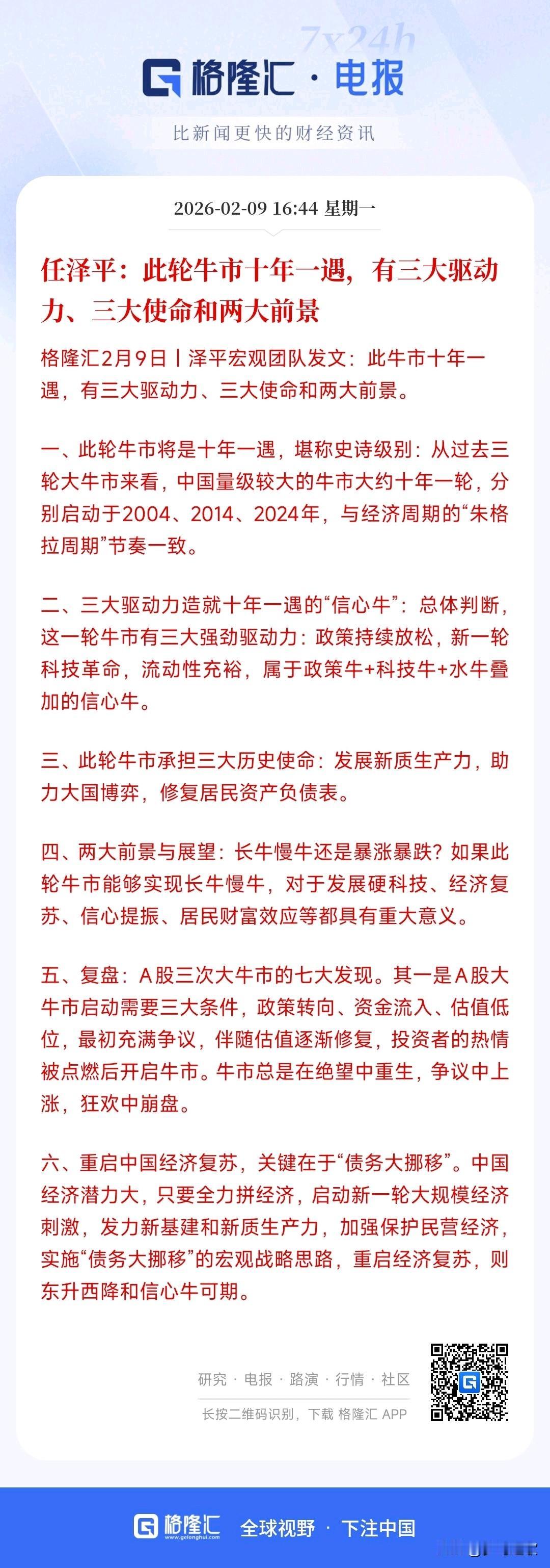 任泽平又发话了,认为这轮牛市十年一遇 任泽平表示:本轮的牛市有三大原因 1.政策持续放松 2.科技股革命 3.持续的流动性 实际上这轮牛市从2025年就开始了,但是只是结构性牛市,去年是科技股的牛市。今年是航天军工,贵金属的牛市,其他的板块基本没有涨,要说全面牛市还是有点不合适的。 散户现在大部分都没有赚钱,虽然指数在往上涨,但是能够赚钱的散户仅仅占了不到20%,可以说是非常的惨。 指数牛现在还在走,就看2026年是否会出现全面牛的情况了。