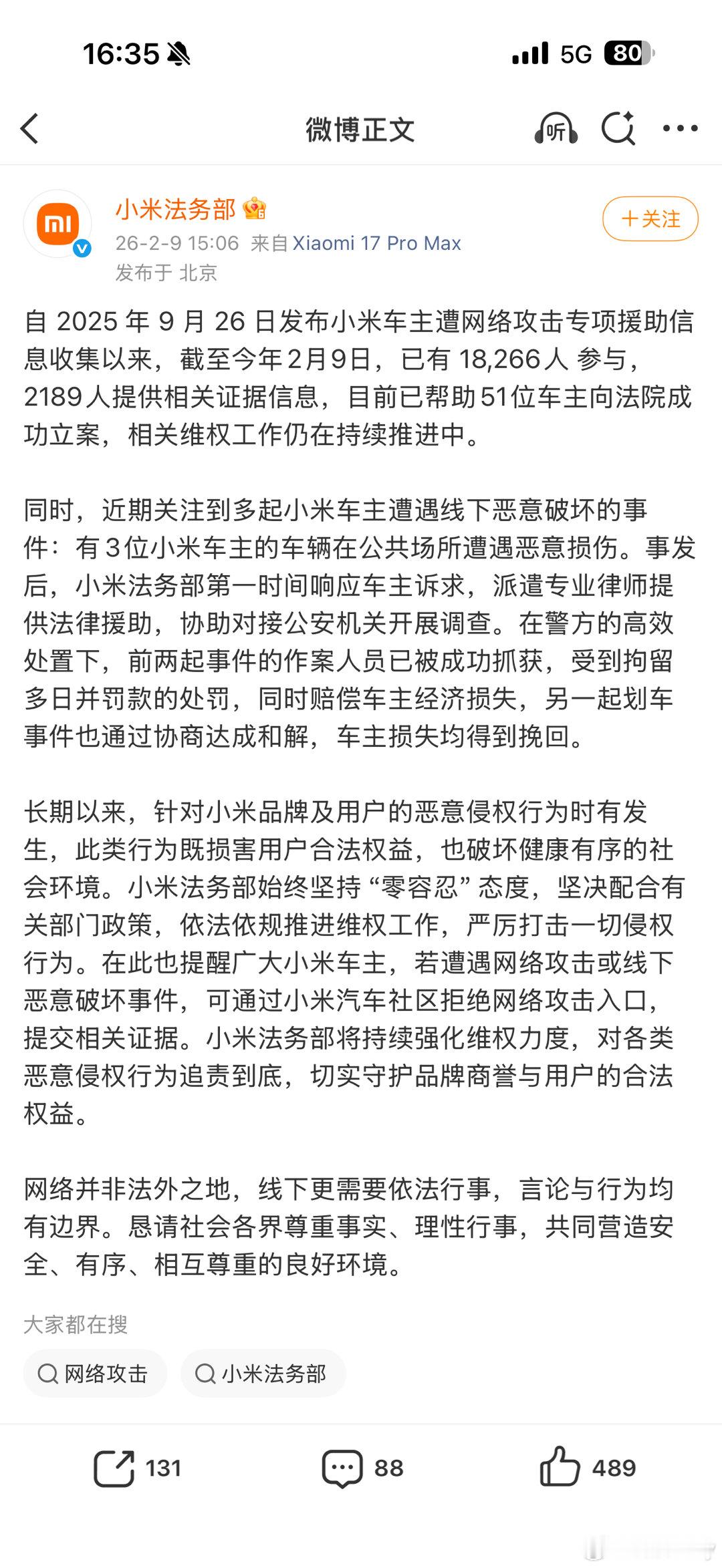 小米法务部公布协助车主维权进展万万没想到,有些“黑粉”真敢动手划车!小米法务部刚公布了一起协助车主维权的进展——嫌疑人已被抓并判赔,车主损失得到补偿。划重点:违法必受惩!