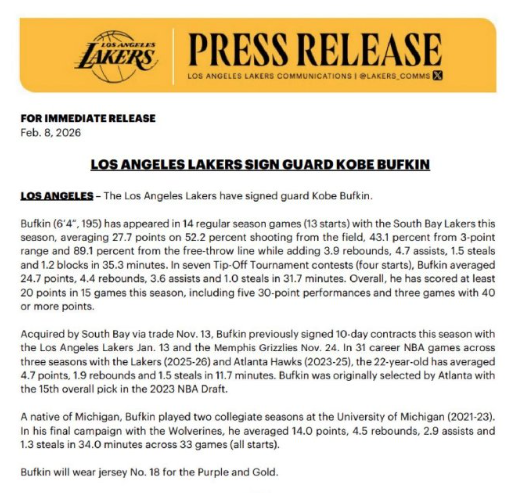 湖人正式宣布已与巴夫金签下NBA合同。合同条款尚未披露,但据报道为一份为期两年,薪水最低的合同,并附带2026-27赛季的球队选项。他将身穿18号球衣! 他本赛季在湖人队的G联赛附属球队南湾湖人队表现出色。这位后卫在21场比赛中场均贡献26.7分,4.1个篮板和4.3次助攻,投篮命中率高达51.3%,三分球命中率也达到了43.1%.