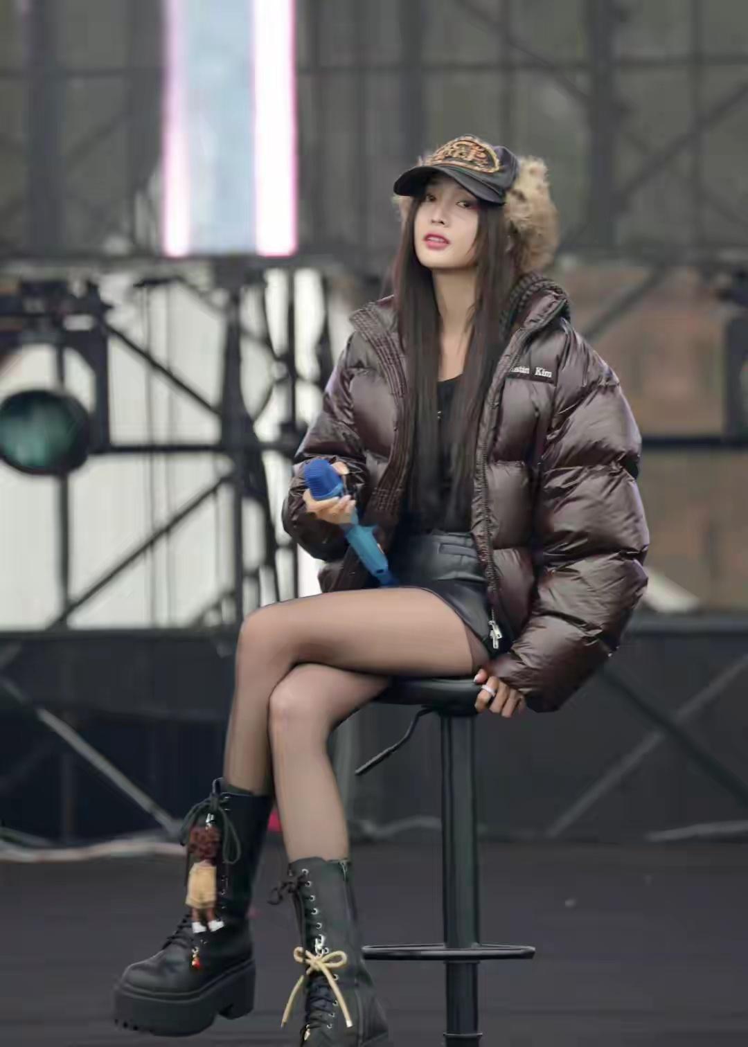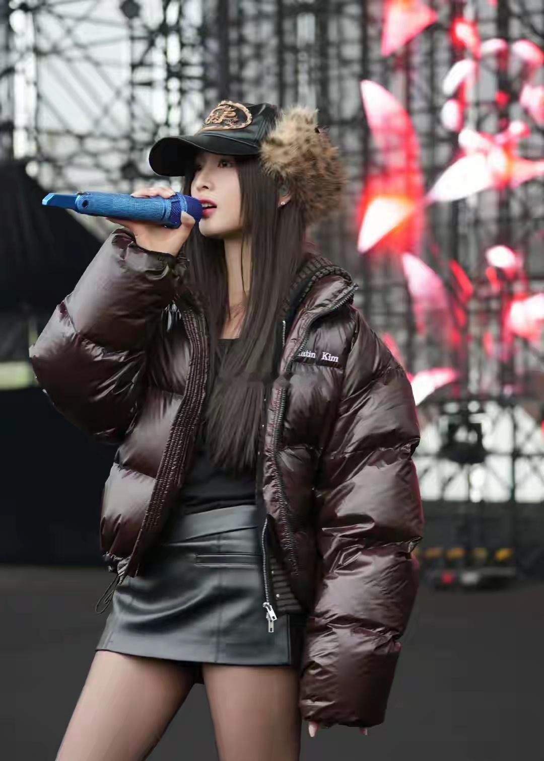 吴宣仪排练场的私服也能穿出大片感!一身亮面羽绒服搭配皮裙黑丝,毛绒帽檐添了几分俏皮,却丝毫不减酷飒气场。