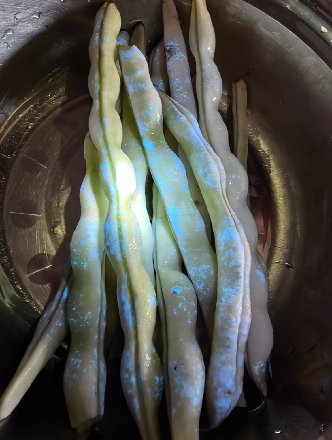 市场上买的豆角,洗完后用紫光灯照了一下为什么是这个颜色的?是不是坏了!