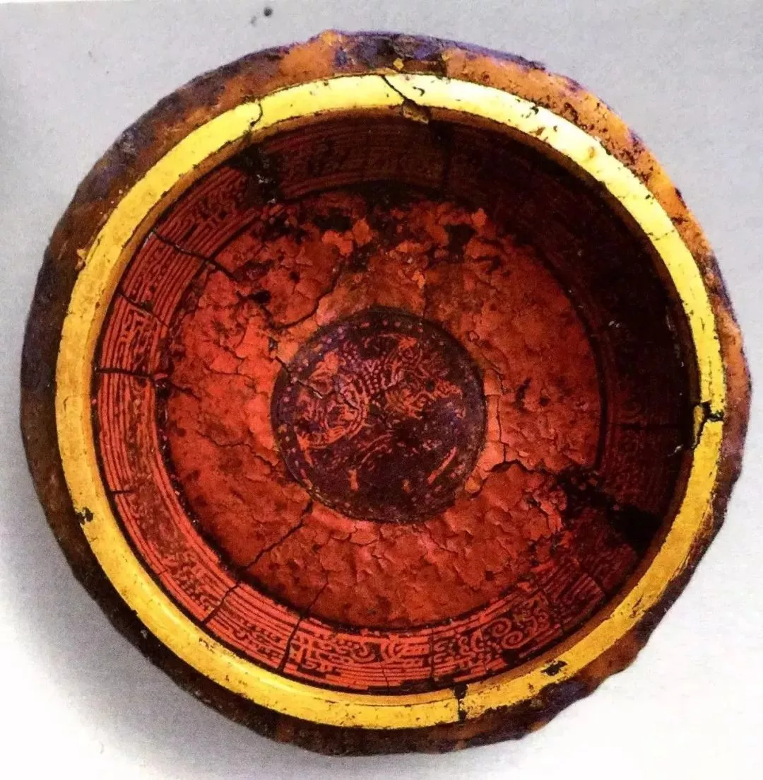 贵州省博物馆藏1959年清镇县新桥汉墓出土的朱绘夔纹海潮纹漆饭盘,盘背面锥刻汉隶铭文:“元始四年,广汉郡工官造乘舆髹㳉画纻黄釦饭盘,容一升。髹工则、上工良、铜釦黄涂工伟、画工谊、㳉工平,清工郎造。护工卒史恽、长亲、丞冯、掾忠,守令史万主”