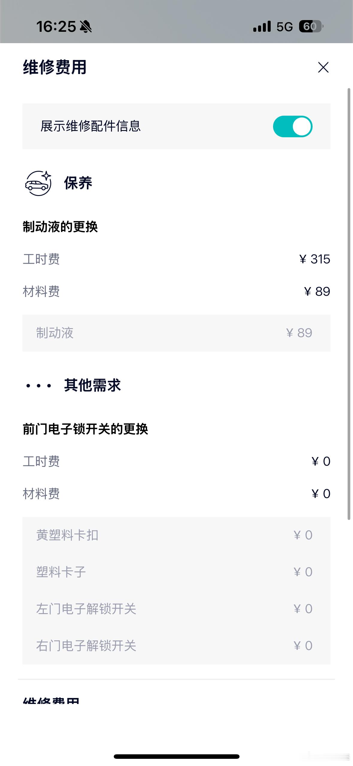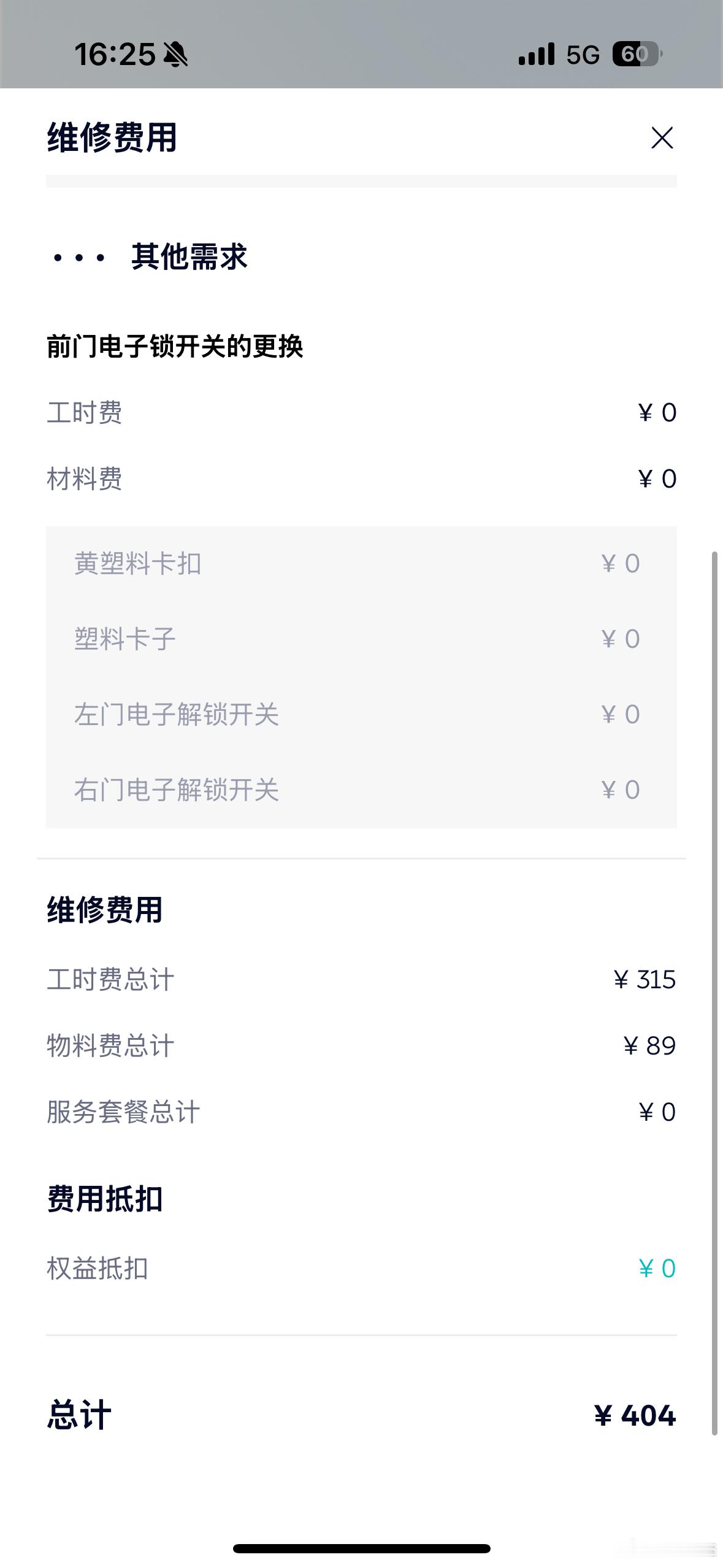 总计花费 404,可以看到物料其实不贵,主要是要拆四个轮子,排空气换油啥的。顺便还给我把两个前门的开锁按键换了,维保专员说,这俩按键有几率崩开或脱落,虽然我一次没有碰到过。