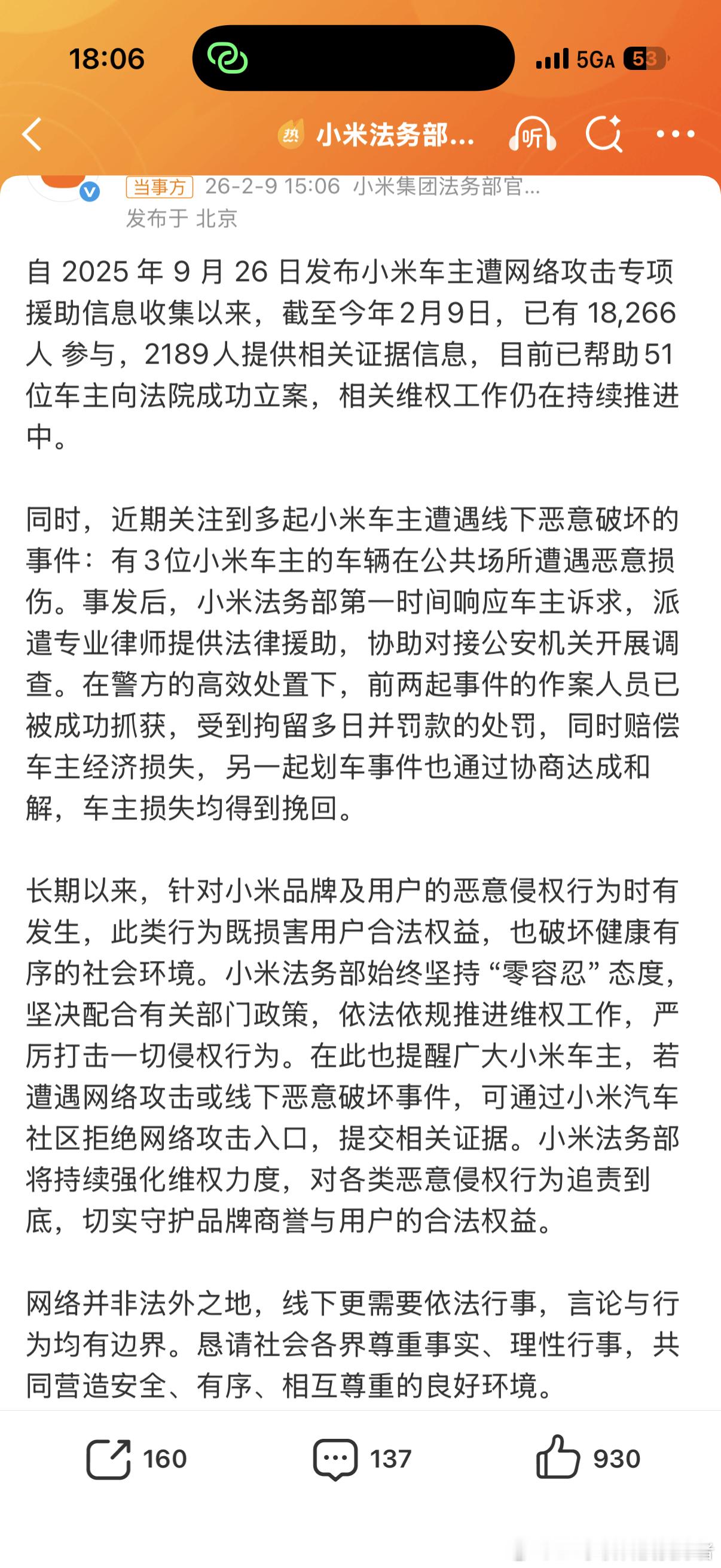 小米法务部公布协助车主维权进展我之前在网上看到过有些故意去破坏小米汽车的人,包括划伤,吐唾沫等等之类的行为,不明白这些人是出于什么心理。即使不喜欢小米,也不至于去破坏车主的车子吧,这属于故意损害他人财产了。小米法务部跟进的挺及时,这种人必须付出代价。