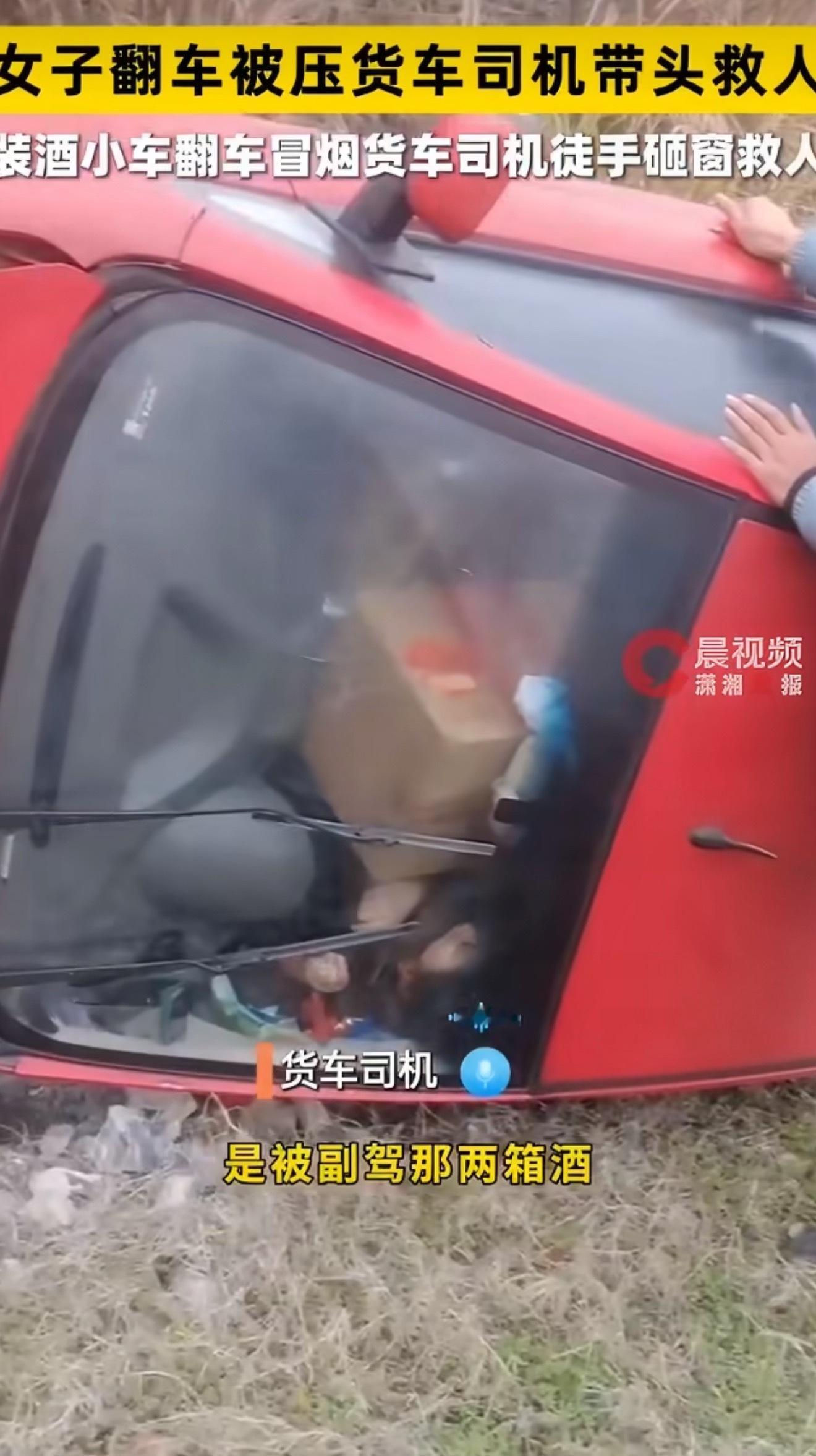 女子翻车被压货车司机带头救人带年货乘火车实用指南装酒小车翻车冒烟货车司机徒手砸窗救人