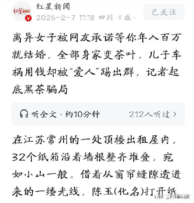 江苏,一离异带娃的女子在网上认识了一个男网友,俩人关系暧昧,男子还发起情感攻势,承诺以后会跟女子结婚。这么一说,让女子脑子一热就完全信任这个男子。之后男子拉拢女子做生意,进行茶叶销售,一年可以赚100万元。女子还真信了,进了20多万的货,谁知道根本卖不出去,后来儿子出车祸急用钱,找男网友求助,对方翻脸不认人,直接还把女子给删除了。 红星新闻2月7日报道了这则新闻。 据报道称,女子本以为这是一场爱情,其实这就是一场骗局,男友的连哄带骗,让她借钱拿货,积攒的茶叶,她这一辈子都喝不完。 陈女士今年55岁,离婚后,一个人带着孩子生活。她有两个儿子,生活压力非常大。 因为是单身离异认识,陈女士也渴望爱情的滋润,也希望可以找到合适的另一半。 在网上认识了一位男子,对方一上来就对陈女士很不错,温柔、体贴,甚至还经常的嘘寒问暖,这让陈女士感到很安心。 不仅如此,男子还经常显摆,要表现自己家境阔绰,似乎有不小的生意在做。 面对这样的男子,陈女士内心可以说,充满了好感,她开始对网上的这位男子有了一些暧昧之情。 再之后,男子发起了爱的攻势,想要追究陈女士。甚至还表示,他不介意是否离婚、有孩子,感觉最重要。最后男子还承诺:会跟陈女士结婚。 就因为这些甜言蜜语,陈女士沦陷了,她彻底相信了眼前的这个男子。 确定关系之后,男友就邀请陈女士到江苏宿迁考察,因为他在那边做茶叶生意,赚了不少钱。 陈女士想都没想,直接就开车前往。 到了那边之后,有不少人都去考察,大家都说,因为做茶叶生意,纷纷买了别墅、开上了豪车,一年都能赚100万。 陈女士有些犹豫,感觉这个不切合实际。男友看到陈女士面露难色,开始借机推波助澜:他就因为这个发家,两个人一起做事业,很快就会有条件结婚了。 听到这里,陈女士心理防线就垮了,脑子一热,就信了男友的话。之后就把自己的积蓄搬出来,甚至还去借钱,凑了20多万购买茶叶。 可是茶叶积累在家,陈女士发现,自己根本就没有销路,很快,货品就积压在家。 最为无助的是,在这个时候,陈女士的大儿子突然出了车祸,需要急救钱。陈女士自己还欠下20多万,哪里有钱拿出来呢。 陈女士立刻就去找自己男友求助,希望他可以帮助自己,解救燃眉之急。 然而谁知道,看到陈女士的信息,男友直接就把陈女士给删除了,还将她踢出了群。 找到这家茶叶的总公司,客服却说:我也很同情你,但是我没有办法。 如今陈女士很崩溃,出租屋里还积压着32箱黑茶,手机里还接收着一条又一条的催债信息,大儿子还在医院里治疗,接下来,她真不知道该怎么过。 再查询这家茶叶公司,如今他们的模式“局”,却还在运转。陈女士想要退货,却没有门路。 本案释法: 女子被男子欺骗,说囤积茶叶好好赚钱,将来就会娶她。女子真信了,购买了20多万茶叶,最后积压卖不出去,要退回对方又给自己删除了。女子应该怎么应对这样的骗局呢? 根据《刑法》第二百六十六条规定,以情感作为幌子,诓骗对方会结婚博取信任,最后诈骗公私财物达到20多万,早就达到立案标准。20万已经属于“数额巨大”,会面临十年以上有期徒刑。 从案件来看,茶叶+情感+层级返利这样的模式,其本质就是以恋爱作为诱饵,说有高回报,以此作为幌子,实施诈骗行为。可以如此定性,区别于普通的经济纠纷。 陈女士此刻要做的是,先报一下警,然后推动调查,形成多线施压。再拨打12315投诉,将这次买茶的经历详细阐述告知,再到相关部门投诉举报,存在这类营销模式,提供证据。 这些都可以辅助陈女士维权,主张撤销诈骗合同,并且积极索赔。对于男友的行为,则可以判定他需要承担刑事责任。 只有踏踏实实的做生意才是稳妥的,宣传说,年入百万,买别墅、买豪车,这些都是噱头,听听就算了,但是真的不能听到心里去,一不小心,就被骗了。 对此,您怎么看呢,不妨一起来留言讨论吧!