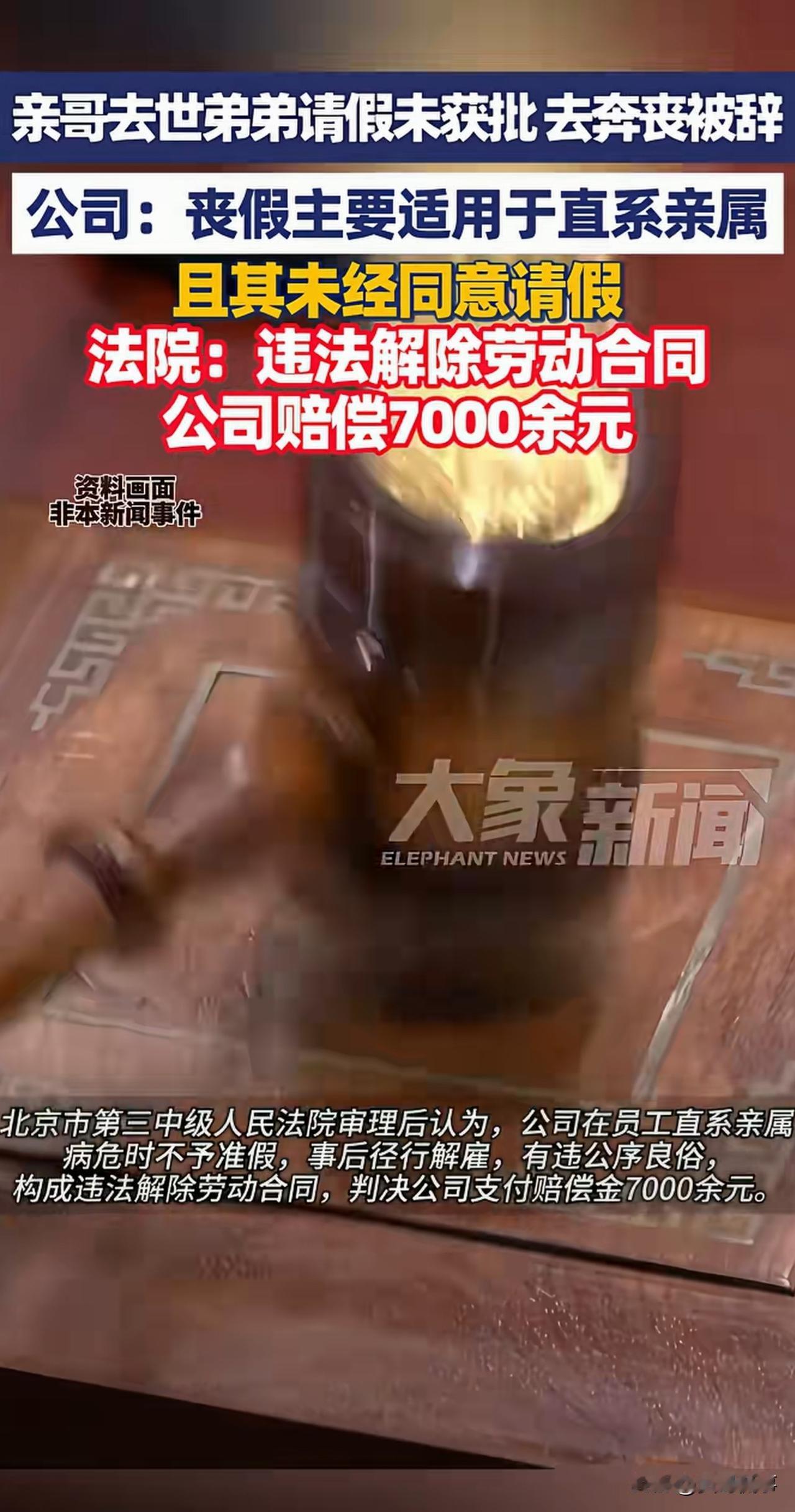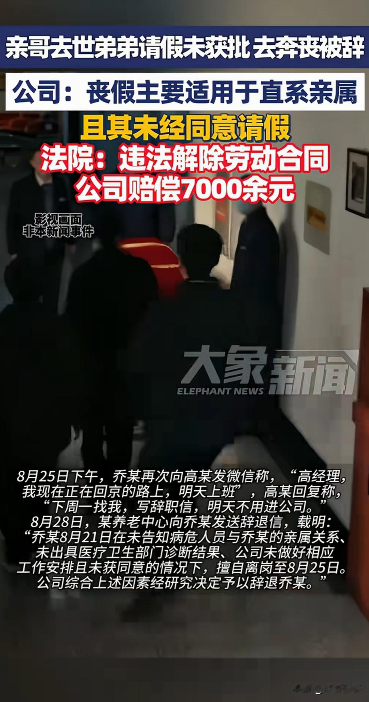 “这样的公司,离开也罢!”北京,一男子因亲哥哥病危离世,便向单位申请无薪休假,但单位却未批准。单位认为,丧假仅适用于直系亲属,而男子的哥哥并不在此范畴。无奈之下,男子只好先回家为哥哥料理后事。 令人意想不到的是,在男子事后返回单位时,单位竟以离岗为由将其辞退。对此,男子自然不服,先是申请了劳动仲裁,随后又将此事诉至法院。结果,男子胜了! 事情是这样的。事发之前,乔师傅在北京当地的一家养老中心从事厨师工作。平日里,乔师傅掌勺做饭勤勤恳恳,和同事、经理相处得也算和睦。 可天有不测风云,乔师傅的亲哥哥突然病危,消息传来的那一刻,他脑子一片空白,第一时间就想回老家。 他赶紧拿着手机,给后厨的直属经理发消息,说明了家里的情况,想请半个月的假,并表示不拿工资都可以。 可经理却当场回绝了,说假期太长,批不下来。 乔师傅当时也没犟,想着再找时间和领导商量商量。 到了第二天晚上,乔师傅的哥哥因没挺过去,人直接就走了。 此时的乔师傅,就如同热锅上的蚂蚁般,也顾不上再走繁琐的请假流程,连夜跟经理发了消息,当晚就得动身回老家奔丧。 在处理完哥哥的后事,乔师傅没敢多耽搁,刚坐上前往北京的火车,就主动给经理发消息,表示第二天会准时回岗上班。 在乔师傅看来,家里出了这么大的白事,作为单位,总能懂这份人情世故。 可万万没想到,经理的回复,直接让他心凉透底——不仅不让他第二天进公司,还让他周一直接去办辞职。 没过几天,单位就直接给乔师傅发了辞退通知,通知中载明,因乔师傅未说清亲属关系、未开医疗证明,且在未对后续工作进行安排并没获批的情况下擅自离岗,属于严重违规,直接作出开除处理。 乔师傅彻底懵了,他认为自己是奔丧,是至亲离世的紧急事,而且全程都在跟单位沟通,并不是无故旷工,怎么就成了违规被开了呢? 他咽不下这口气,便先找到劳动仲裁处理,在对处理结果不服后又诉至法院,要求公司给付无故辞退的赔偿金。 此事也引起了广大网友的热议: 有人说:“直系亲属指父母子女和配偶,亲哥哥可能的确不算,但是这种白事总还是要给请假的,毕竟人生大事,这辈子见最后一面了。” 也有人表示:“公司不是做慈善,请15天假肯定太长了,公司当然不能批。但从实际情况看,乔师傅只请了5天,并不出格,公司应当要理解。” 的确,《劳动合同法》第39条明确规定,员工严重违反规章制度,单位可解除合同 。 那么在这里需要明确的是,乔师傅在未准假的情况下,而回家奔丧是否属于严重违反规章制度。 从事实来看,乔师傅的哥哥病危去世,属突发家庭急事,他在多次沟通、主动提不带薪事假未果后,不得已擅自离岗,且事后也及时返岗。 乔师傅主观并没有故意离岗,客观上也没有对公司造成重大不良影响。 所以,乔师傅的行为并不构成“严重违规”。 而且,根据公司的说法,哥哥去世虽不在法定直系丧假范围,但请事假则是员工基本权利。 在乔师傅主动提出不带薪休假的情况下,公司不准假还事后解雇,此做法既不合人情,也违背善良风俗,难免会让人寒心。 法院在对案件进行审理后,也认定了公司开除乔师傅的行为违法,最后判决由公司向乔师傅支付7000元的赔偿金。 有网友直言,判断公司做法正确与否,其实很简单:不妨让公司的管理层扪心自问,如果他们遇到了乔师傅这种至亲离世的事,是否依然能镇定自若地坚守岗位呢? 对此,你怎么看?欢迎大家在评论区留言。