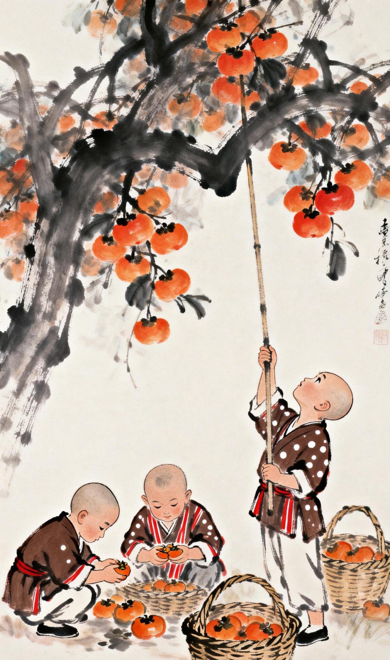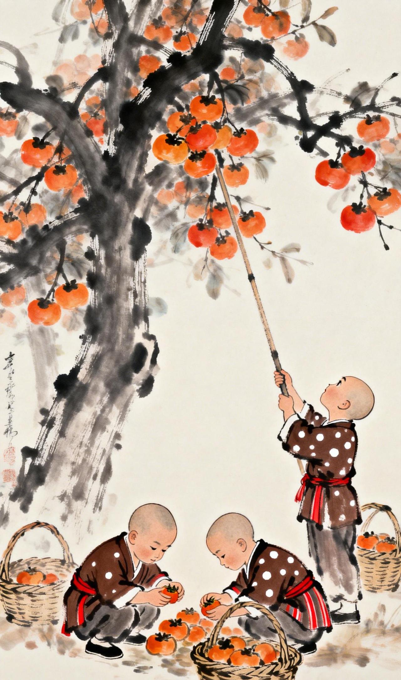 柿荫禅趣 秋深柿熟,满树悬金。枝叶疏朗间,三五果实低垂轻晃,似含笑意。一僧仰首执竿,衣袂微扬,长竿探向高枝,专注中透着稚拙。两僧席地轻拢入篮,指尖流转如抚露珠,竹篮渐满,秋光也渐沉凝。 墨色浓淡皴染出暖意,赭红点点便是人间清欢。枝头垂垂,篮中盈盈,寻常农禅光景里,“柿”与“事”的吉祥谐音已悄然融入呼吸。竿尖将触未触的刹那,光阴停驻成永恒——原来如意不必远求,只在俯拾之间。 柿柿如意