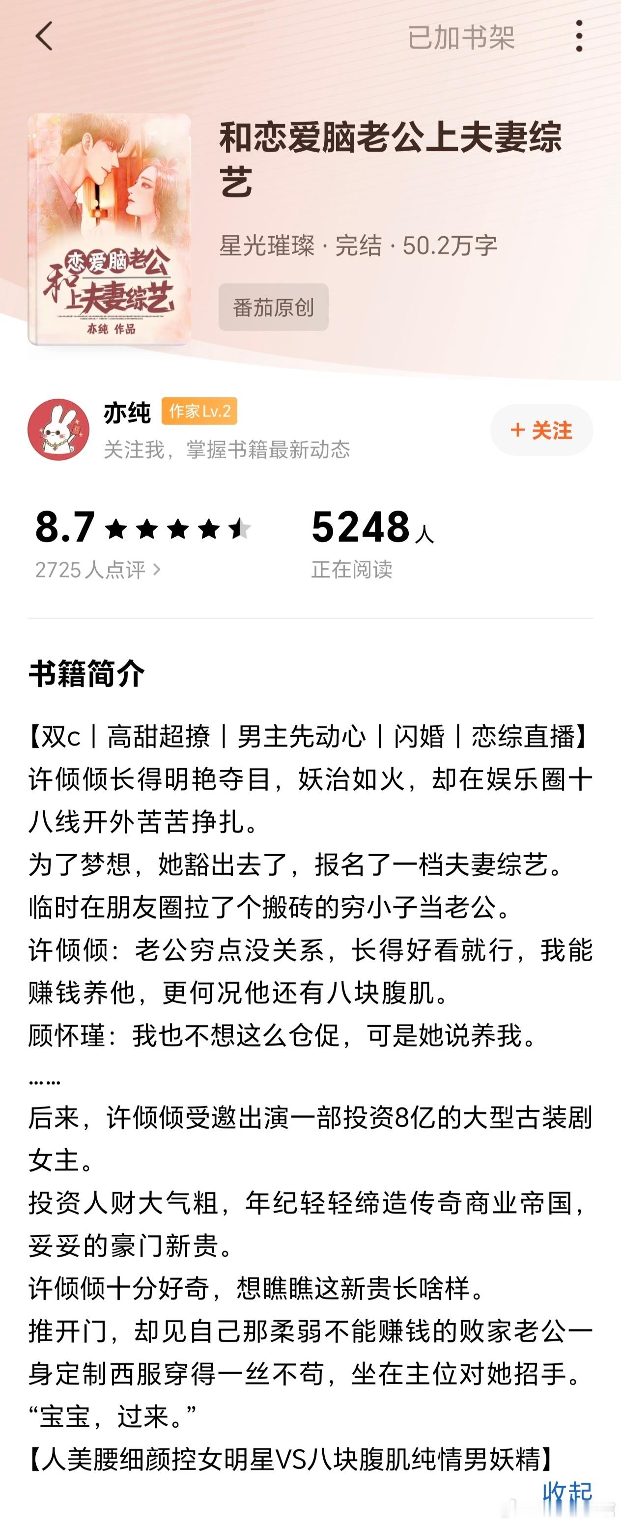 推文 《和恋爱脑老公上夫妻综艺》作者:亦纯高颜值十八线女明星×纯情男妖精,闪婚,女主视角先婚后爱,男主视角暗恋成真女主因为黑料没有工作,又赔不起违约金,答应上夫妻综艺,但是她没男朋友没老公,想到了上学时的同学,也就是男主,找男主来假结婚男主暗恋女主,但是他太闷了,不知道怎么表达,后来分开了,不知道用什么理由去接近。女主联系他假结婚的时候,立刻答应了,假结婚要变成真的。女主看来是假结婚,但是证是真的,男主是要假戏真做女主一直以为男主很穷,男主有欠债的爸,他还摆摊修手机。再次见面男主一身工地套装,以为他在工地上班。其实男主是科技大佬,幕后老板,贼有钱,女主以为他穷,他就顺便装弱了男主虽然话不多,但是出口就很茶,女主总是忍不住给他勾引,男主色诱刚好在她心巴上。在综艺里男主也是很护妻,幕后给她解决了很多事男主帮女主解决渣爹,给她工作表现机会,展现她的实力。后面女主知道男主是大佬时,还挺生气的,不过后面被哄好了,男主实在是太会了总体是篇无脑小甜文,书荒可看