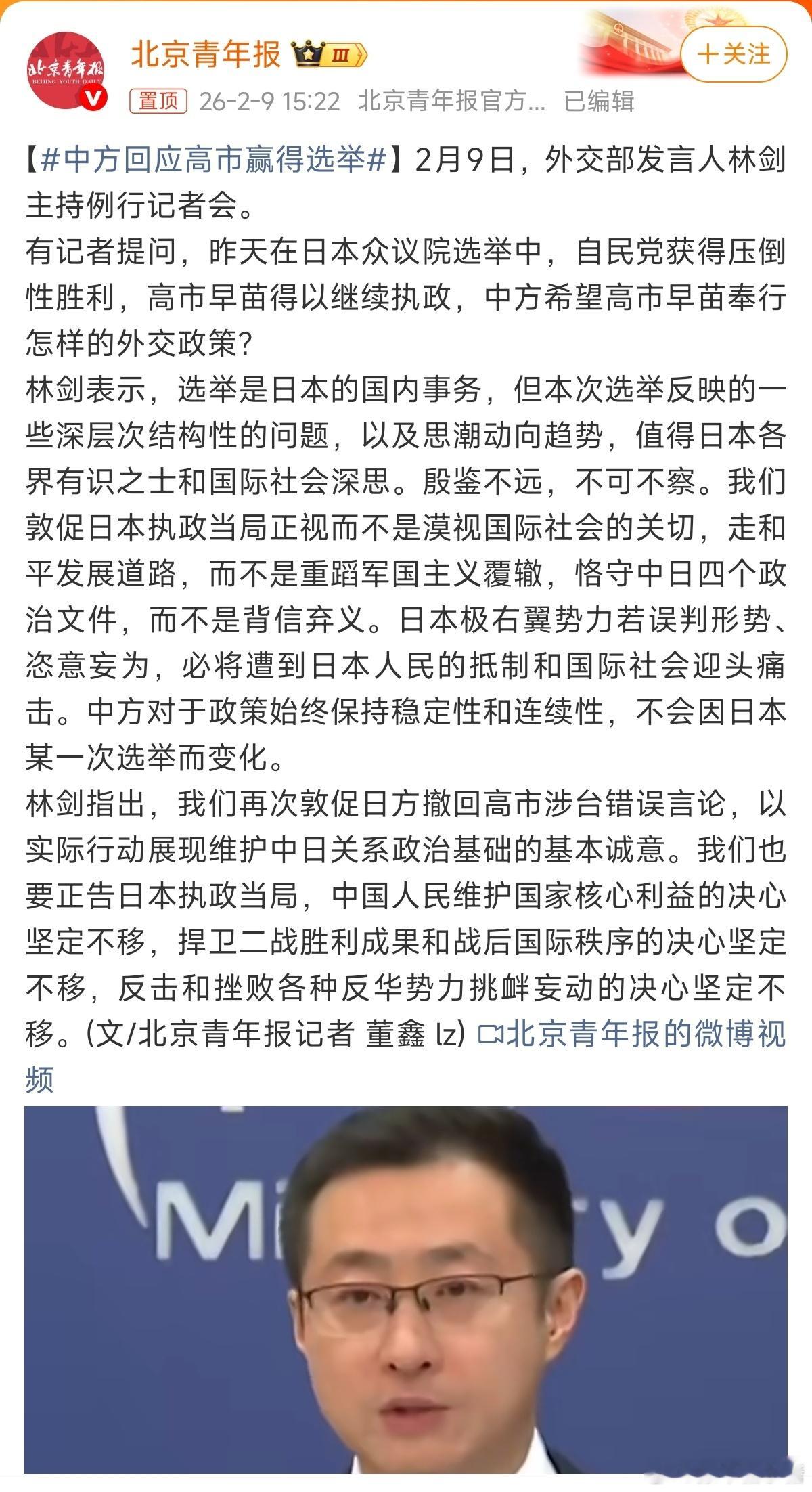 中方回应高市赢得选举所以这次小日子的选举就能很清晰的看出来,小日子上下都有问题没必要再幻想他们会好好的