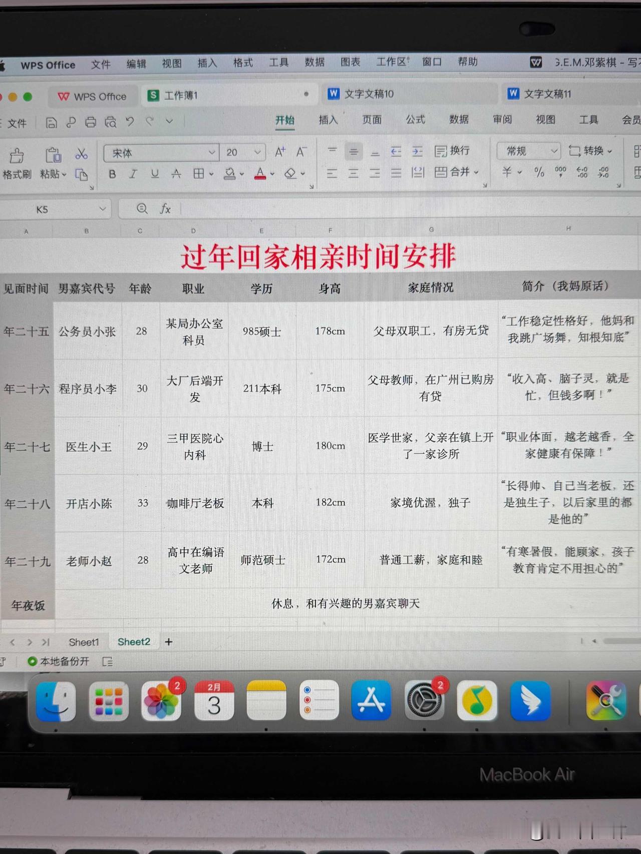 我妈:一天一相,年前清仓 昨天公司一出放假通知,我就打电话跟我妈说买了年24的票回家。今天睡醒微信直接炸了,给我连发了五个男嘉宾的资料,说让我赶在过年前集中相完,刚好一天一个(我们那正月一般不相亲) 我真服了,自己罗列了一下,行程密度堪比明星赶通告。本春节工位主理人假期还没开始就被重新命名为春节相亲主理人