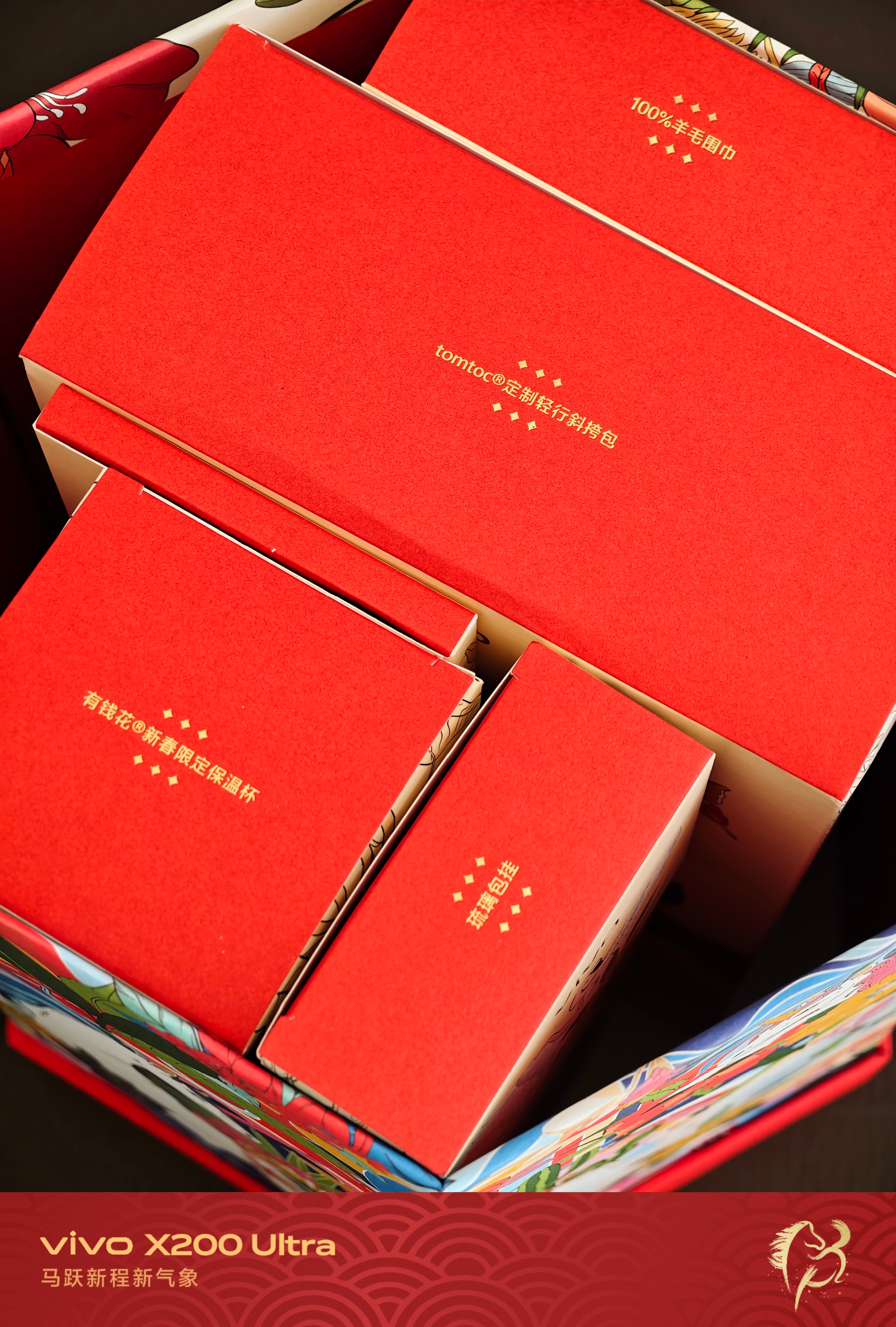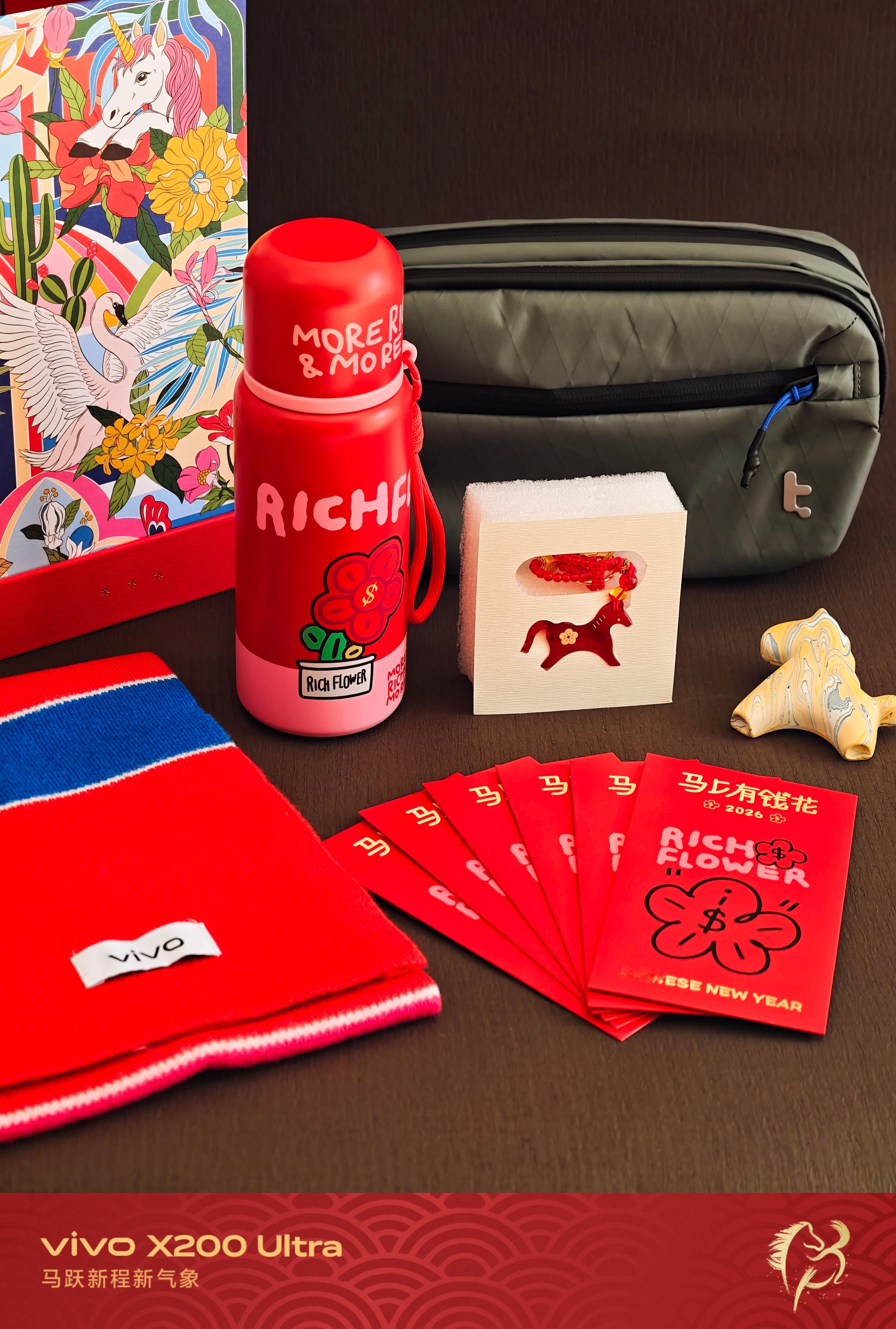 还得是vivo今年的新年礼盒主打一个照顾全家人:红色琉璃小马挂件归领导,小朋友拿走了有钱花保温杯和红围巾,香薰放到车上,最后留下数码胸包是我的,正好过些天出去玩的时候拿来装vivo手机