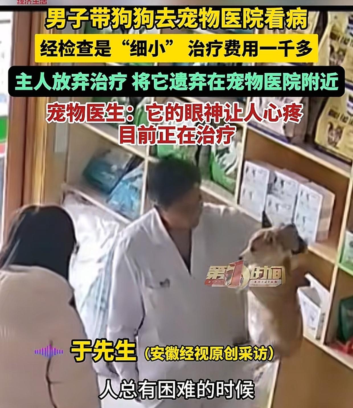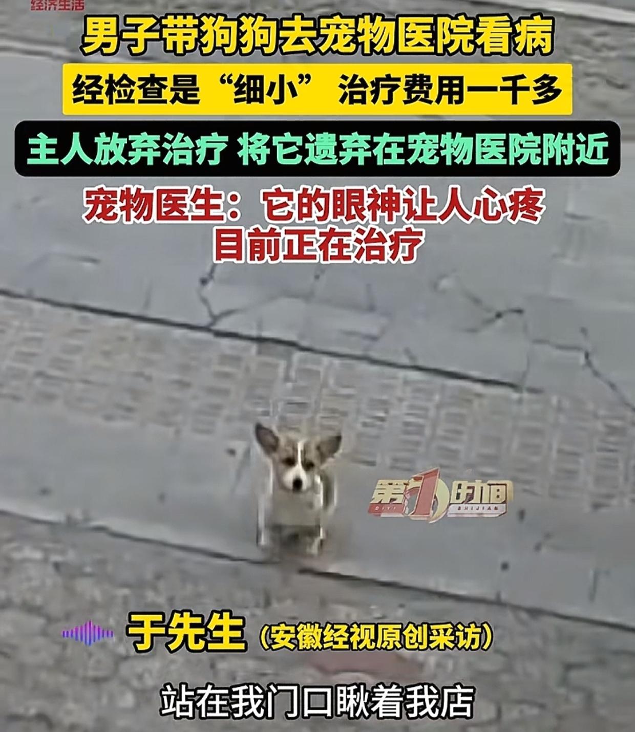 青岛,男子带小狗去宠物医院,医生检查后说是细小病,要花1000多元。男子考虑了几分钟后离开了,过会儿医生往门外一看吓了一跳。 他发现男子并未带走小狗,而是把它放在了树下的一个纸箱里。听见声音,小狗从纸箱里摇摇晃晃走了出来,蹲在门口看着医生,可怜巴巴的眼神让人心疼。 医生受不了这一幕,毅然走过去,把小狗抱进了店里,开始为它输液救治,一直忙到晚上10点多。 后来医生联系了把小狗弃之不管的男子,男子表示,自己实在没能力治,之所以把小狗放在门口就是想让医生救它一命。 医生表示理解,他说人都有困难的时候,不管男子有钱没钱,他都会尽力救治小狗。 看完视频,笔者很想说两句。 男子将小狗放在宠物医院门口一走了之,也许却有苦衷,实属无奈之举,也许他不该应轻易放弃责任,哪怕是采用分期付款的方式,也不该将救治成本转嫁给医院。 但不管怎样,医生的免费救治行为让我们看到了一道温暖的光。 医者仁心,不仅体现在救人,也体现在救治小动物。 医生虽然只是免费救治了一条小狗,但也让我们看到了为医的基本态度,医生挣钱是为了生活,但救治不仅仅是为了挣钱! 在这件事情中,小狗何其有幸遇到了善良的医生,而医生对生命的这份尊重和职业的使命感真的让人很敬佩!