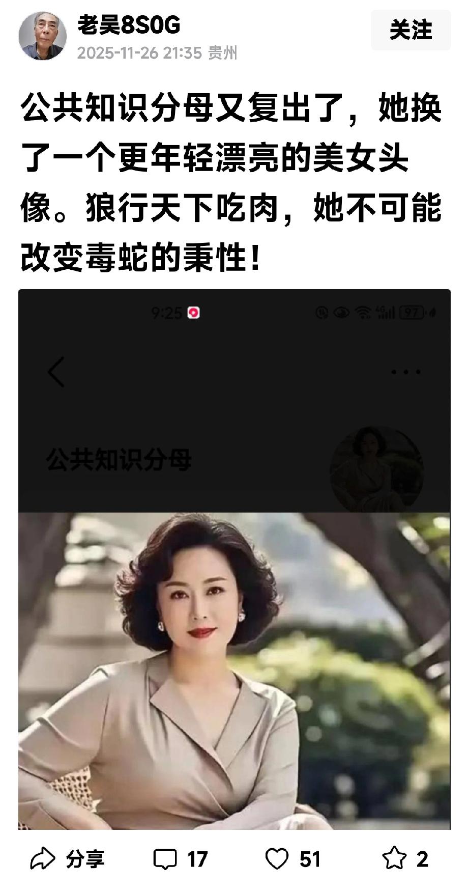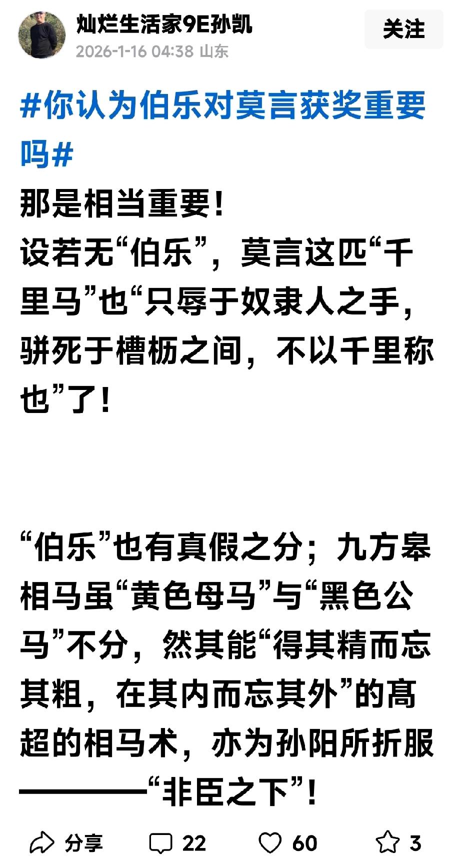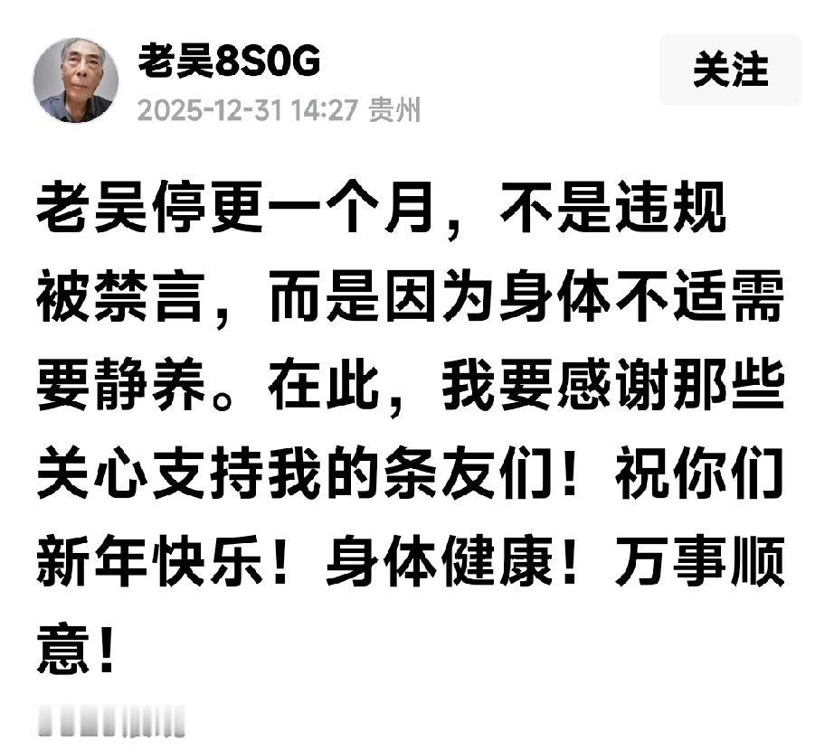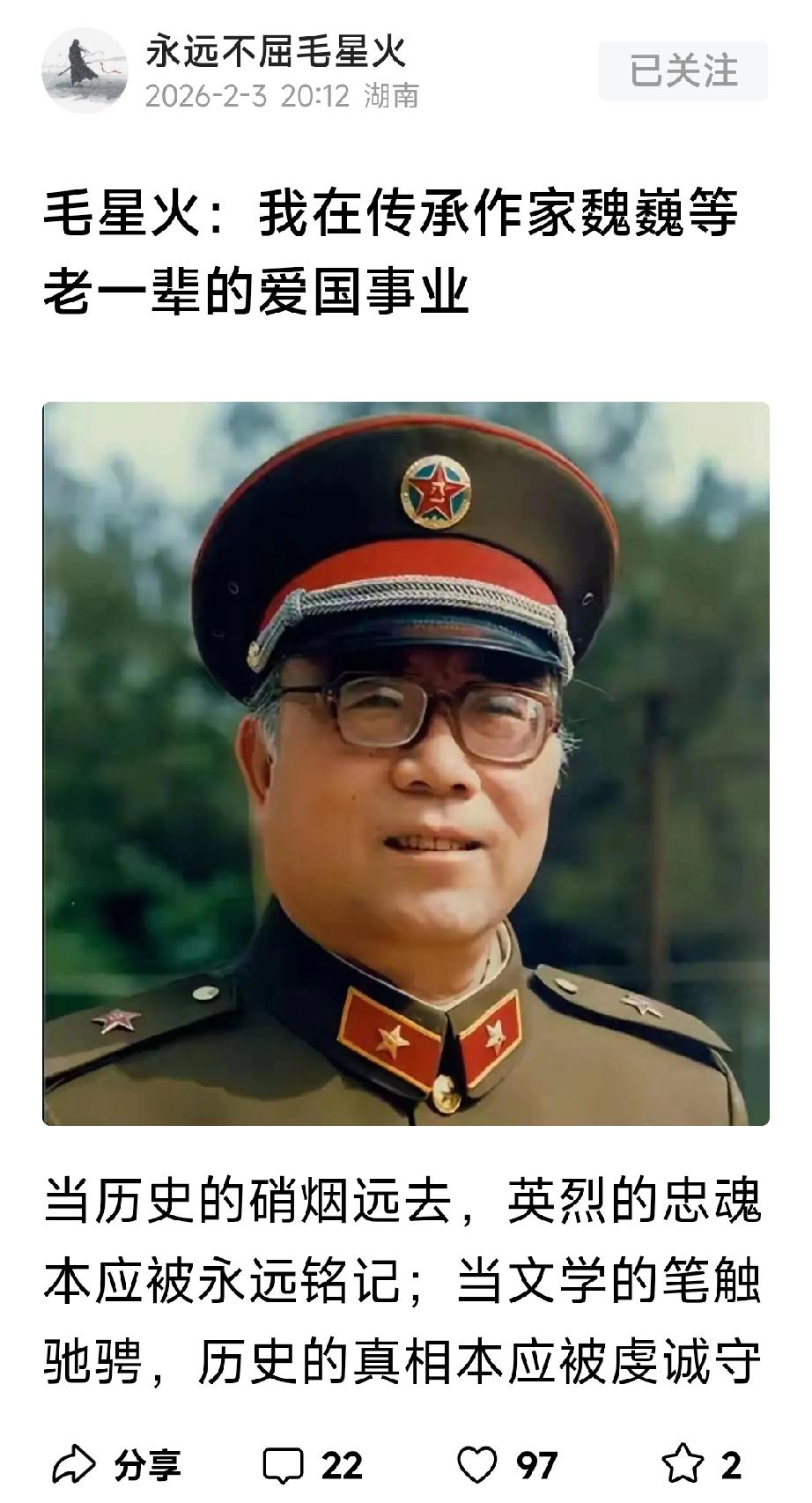 毛星火等人为何突然都停更了 毛星火在《今日头条》上的账号“永远不屈毛星火”突然定格在6天前最后的一篇文章:《毛星火:我在传承作家魏巍等老一辈的爱国事业》,他的文章里面说了什么我不知道,但他停更的原因我估计是因为说大话噎住了。 我从小的时候就记得大人的教导:“过头饭能吃,过头话不能说”,我觉得毛星火这篇文章说的口气是太大了,一个小学四年级都没有毕业的农民,似乎真的在扛起了中国文学的大旗,似乎就是他的传承老一辈作家的爱国事业,这么让人想起来都发笑呢! 当然他的突然停更与这篇文章是不是有直接关系我不知道,但毛星火这样不知天高地厚的人迟早被禁言封号这应该是肯定的,互联网不是法外之地,平台更不是法外之地。 看到毛星火的突然停更,我倒想起一个贵州的老吴先生,他虽然80多岁,而且身患重病,每天靠吸氧维持生命,但他的斗争精神却是非常可贵的,曾经誓言“五数六害不消灭,没脸见为人”,其他的许多事情就不作评论了,毕竟人家现在已经不讲话了,但就从他最后发表了一篇文章也可以看出此人是多么厉害了! 他这篇小文是11月26号写的,是说@公共知识分母 的: ——公共知识分母又复出了,她换了一个更年轻漂亮的美女头像。狼行天下吃肉,她不可能改变毒蛇的秉性! 这篇文章发表以后老吴就停更了,一直停更了一个多月,直到2025年的最后一天,@老吴8S0G发了一个帖子:“老吴停更一个月,不是违规 被禁言,而是因为身体不适需要静养。”当然,对老人家说的话,我们是应该相信的,但从他对公共知识分母的评论当中似乎不可能身体不适啊,应该是精力非常充沛的。 当然,由此又想到了另外一个人,那就是齐鲁名流孙灿烂,一个把天山热土的文章吹捧为“天山体”的@灿烂生活家9E孙凯 先生,从今年1月16号也开始停更了,就连在半枝莲文章后面点赞评论都不干了。 他最后的文章是: 你认为伯乐对莫言获奖重要吗 那是相当重要!设若无“伯乐”,莫言这匹“千里马”也“只辱于奴隶人之手,骈死于槽枥之间,不以千里称也”了! “伯乐”也有真假之分;九方皋相马虽“黄色母马”与“黑色公马”不分,然其能“得其精而忘其粗,在其内而忘其外”的髙超的相马术,亦为孙阳所折服————“非臣之下”! 但若把孙阳的儿子也视为“小伯乐”或“嫡传伯乐”的话,那可就乱套了!因为“小伯乐”能相、能“牵”回家的也只是一只“此马好跳,不堪御也”的“大癞蛤蟆”[大笑][大笑][大笑][大笑][大笑][大笑] 本人才疏学浅,也不知道他到底是不是这文章的原因而休息的,但我知道他们都是一条战壕里的战友。