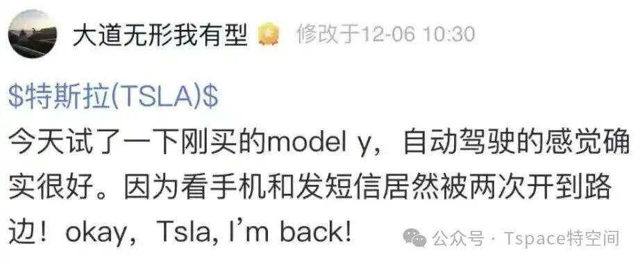 随后,他购入了特斯拉Model Y,坦言在试驾过程中,智能辅助驾驶的体验“确实很好”,通过分享亲身驾驶感受展现出对特斯拉产品力的认可。