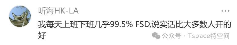 真实的用户体验与案例更具说服力。特斯拉车主听海HK-LA 分享日常通勤体验:“我每天通勤99.5%的路程都交给智能辅助驾驶,说实话,它比大多数人开得好。”