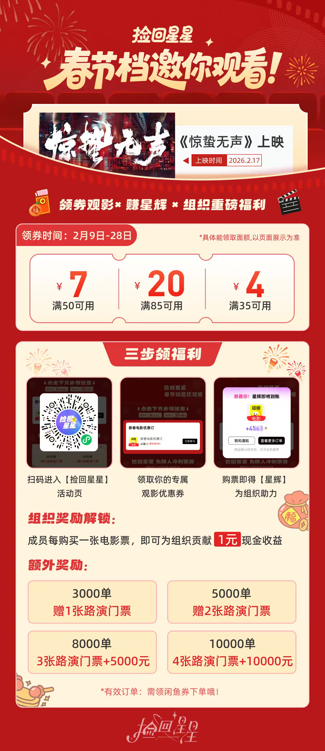🕒活动时间:2月9日-2月28日📌活动参与方式:点击 网页链接 进活动页面,点击任务跳转闲鱼领电影优惠quan,贝勾票得星辉*优惠tips:50-7/35-4/85-20 不同面额 以实际领取为准