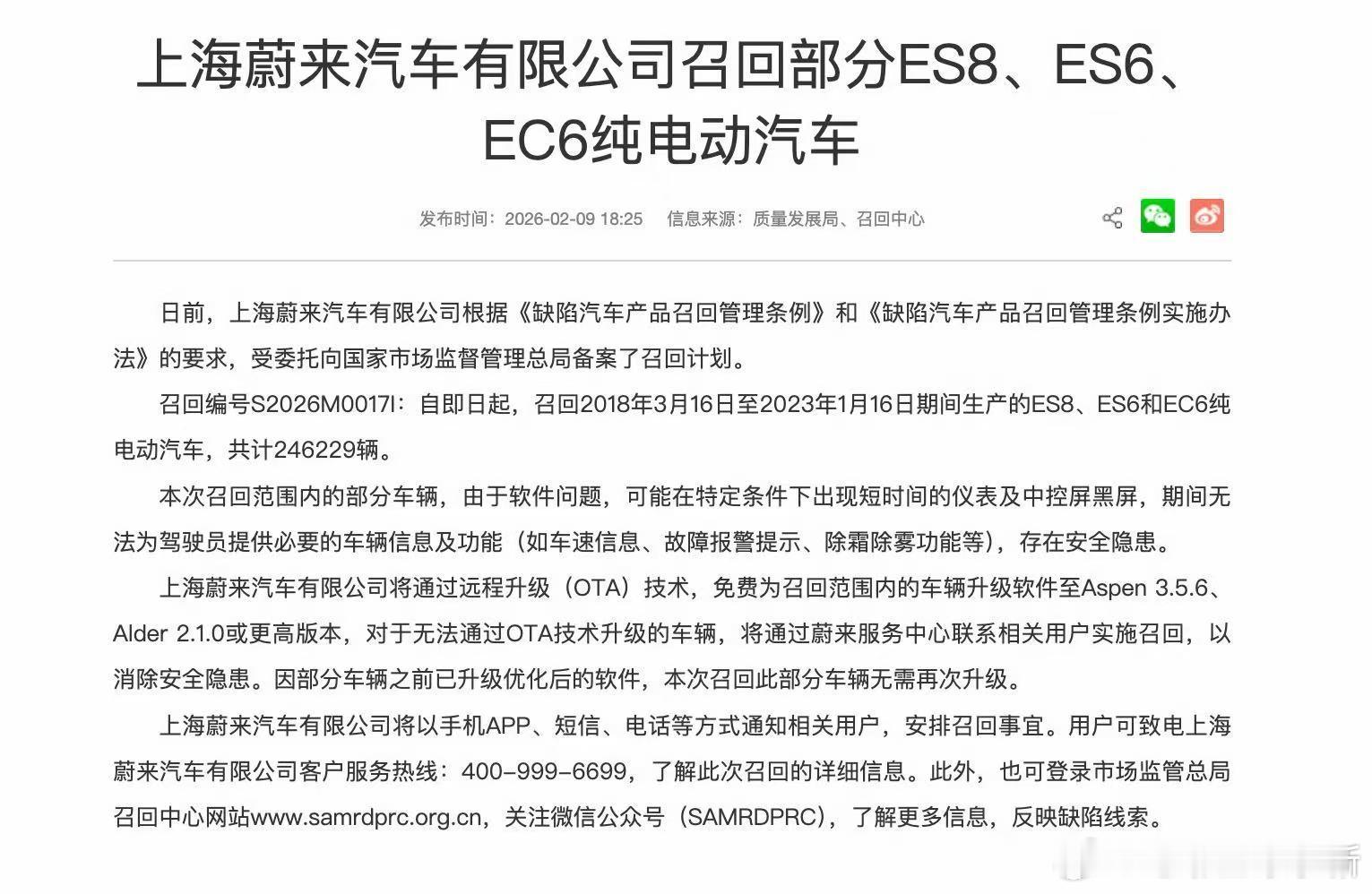 蔚来召回部分 ES8、ES6、EC6,共计 246229 辆