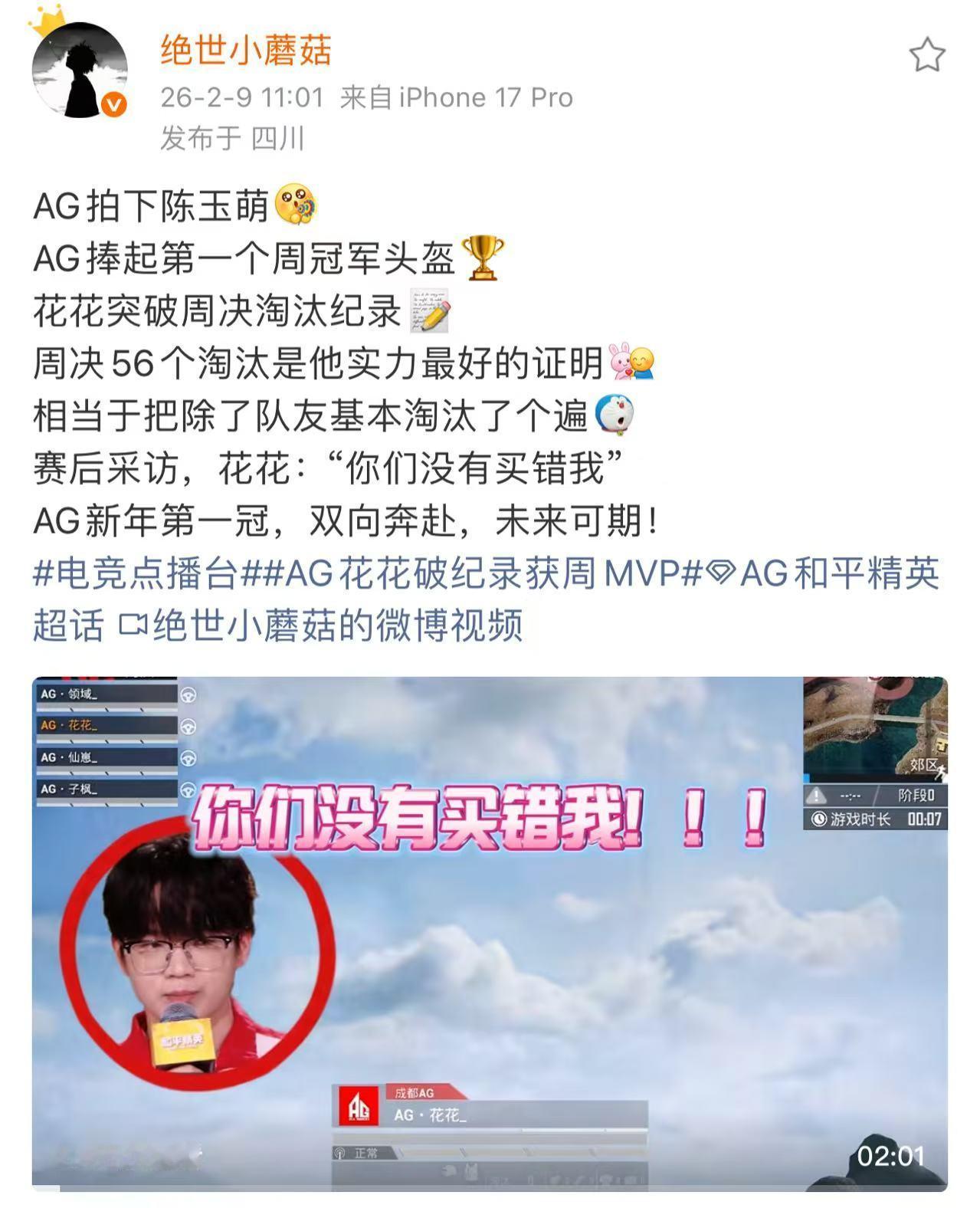 当周冠军头盔举起的瞬间,花花的坚持有了答案,AG的信任有了回响,这枚队史首个周冠奖杯,是花花与AG相互成就的最好见证。花花说AG没有买错人