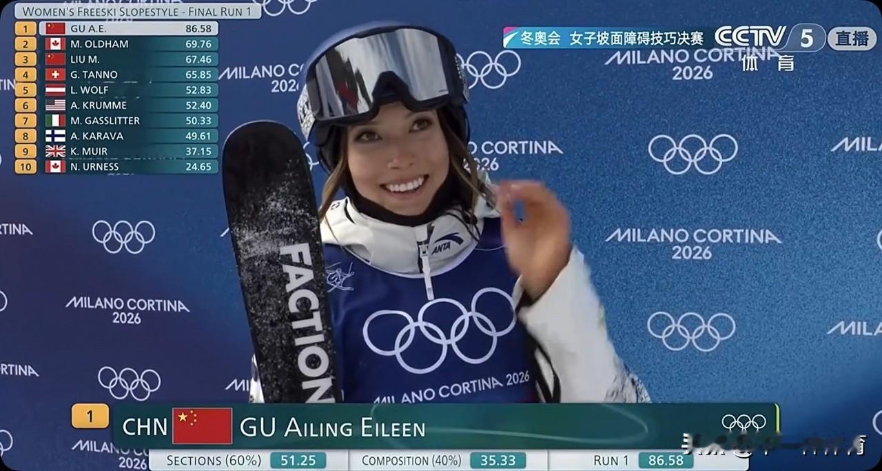 谷爱凌米兰奥运会女子自由式滑雪坡面障碍技巧决赛第一轮86.58分暂时排名第一位。 刚刚进行的米兰冬奥会女子自由式滑雪坡面障碍技巧决赛第一轮,中国球员谷爱凌第11个出场,防守非常不错,获得96.58分,暂时排名第一轮之后的第一位。决赛有三轮,取最好得分确定最终排名!谷爱凌太棒了!