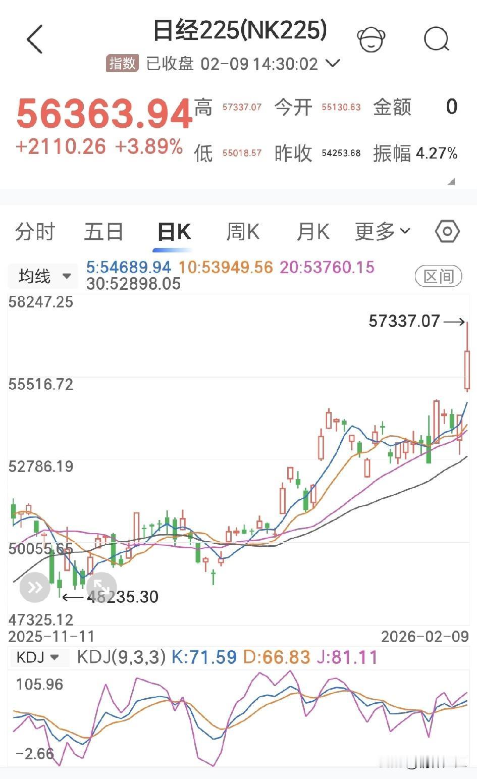 受日本大选的结果刺激,日本股市指数创历史新高。这种市场表现表面看起来是市场对高市早苗继续执政、自民党成为议席过半执政党的政治结果刺激产生兴奋。但是,盲目乐观的表现是昙花一现还是持续高涨?拭目以待吧!据我认为,这种创新高的行情必定不是好事,它蕴藏后市的重重危机。高市政府的积极财政政策和不断扩增军费的措施,对老年化严重的日本社会是祸不是福,其之前的不当言论激发与中国的矛盾,造成经济的反制也将是常态化。如此情况下,日本股市放飞自我,其实就是给自己吃春药兴奋剂,其表现能够持续多久令人怀疑。