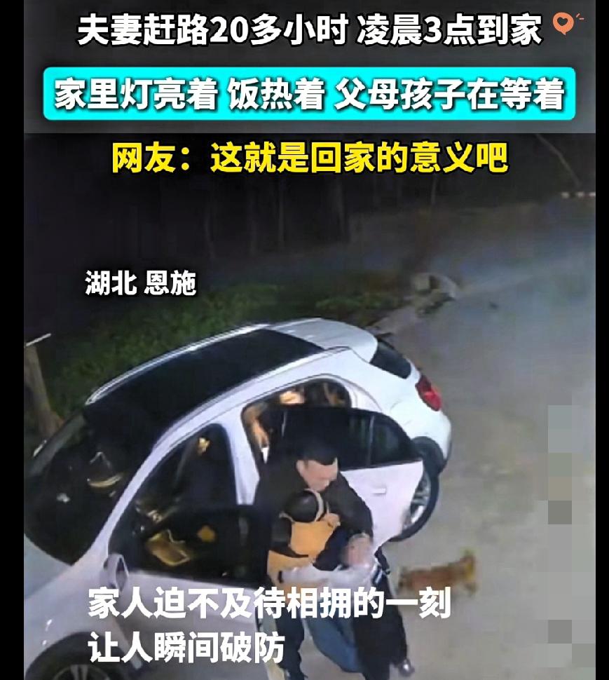 浙江夫妻开20多小时车凌晨3点回湖北老家过年,本想让家人安睡,推门却见满室灯火,热饭排骨早已备好,老人孩子守在门口翘首以盼,这份偏爱,直接把回家的意义揉进了烟火气里! 夫妻俩让家人别等,可在家人心里,归人未到,团圆的夜就不算完整,一整晚的等待,一锅温热的排骨,都是藏不住的惦念。 我们总在外奔波,想着衣锦还乡才不算辜负,却忘了家人从不在意你混得好不好,只盼你平平安安归来。 那盏深夜为你亮着的灯,那份不顾疲惫的等候,从来都与金钱无关,这是独属于家人的双向奔赴,也是世间最踏实的温暖。 家的意义,从来不是荣华富贵,而是有人把你放在心尖,等你回家。 原来最治愈的幸福,就是万家灯火中,有一盏为你而亮。 你的家里,也有这样暖心的等待吗?